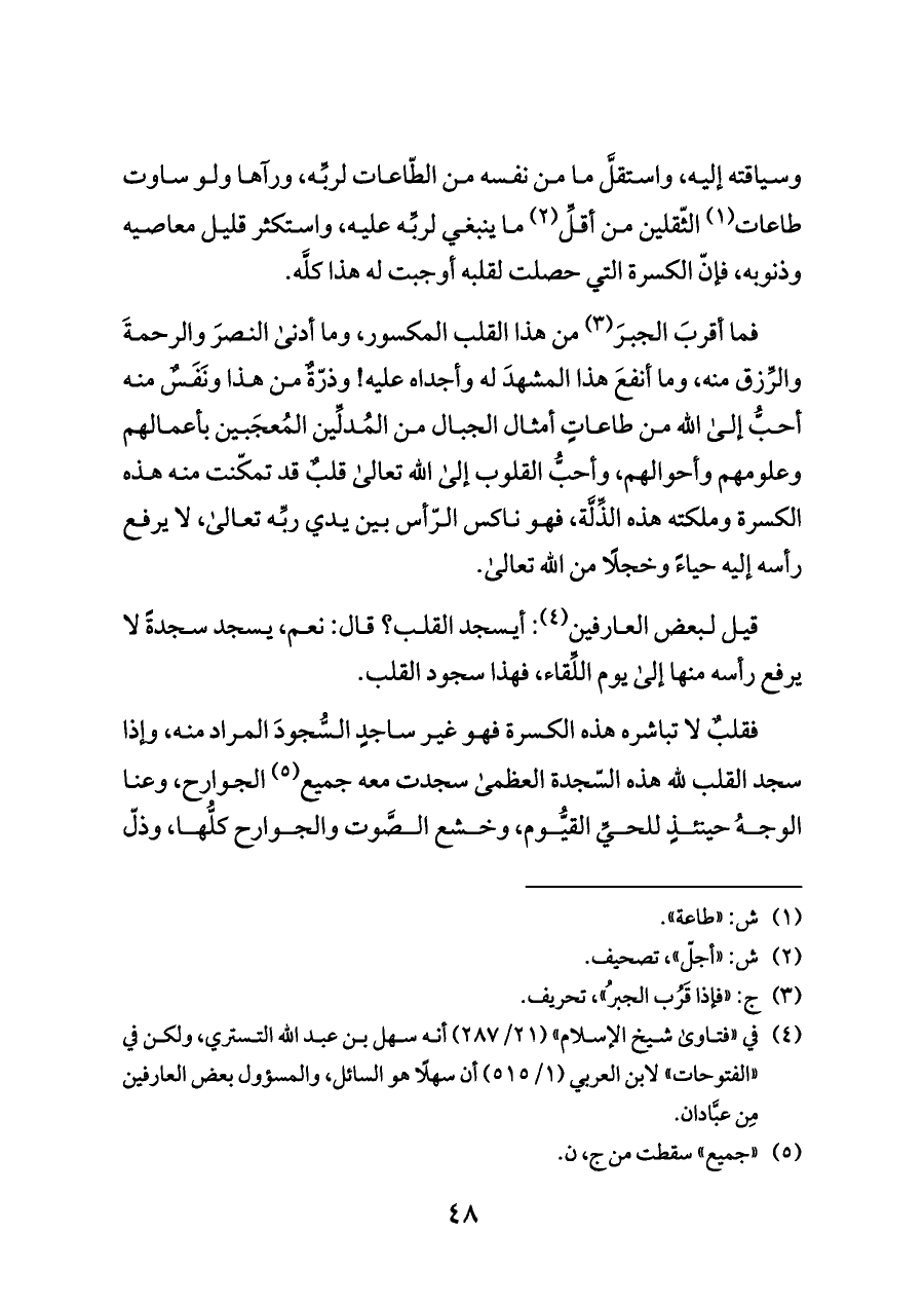 فقلبٌ لا تباشره هذه الكسرة فهو غير ساجدٍ السُّجودَ المراد منه، وإذا سجد القلب لله هذه السّجدة العظمى سجدت معه جميع (¬٥) الجوارح، وعنا الوجهُ حينئذٍ للحيِّ القيُّوم، وخشع الصَّوت والجوارح كلُّها، وذلّ