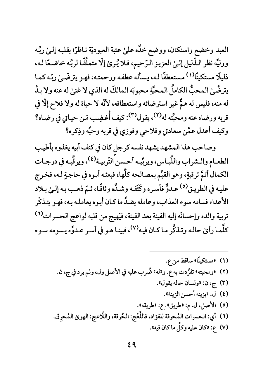 وصاحب هذا المشهد يشهد نفسه كرجلٍ كان في كنف أبيه يغذوه بأطيب الطعام والشراب واللِّباس، ويربِّيه أحسن التّربية (¬٤)، ويرقِّيه في درجات الكمال أتمَّ ترقيةٍ، وهو القيِّم بمصالحه كلِّها، فبعثه أبوه في حاجةٍ له، فخرج عليه في الطريق (¬٥) عدوٌّ فأسره وكَتَفه وشدَّه وثاقًا، ثمّ ذهب به إلى بلاد الأعداء فسامه سوء العذاب، وعامله بضدِّ ما كان أبوه يعامله به، فهو يتذكّر تربية والده وإحسانَه إليه الفينة بعد الفينة، فيَهيج من قلبه لواعج الحسرات (¬٦) كلَّما رأى حاله وتذكَّر ما كان فيه (¬٧)، فبينا هو في أسر عدوِّه يسومه سوء