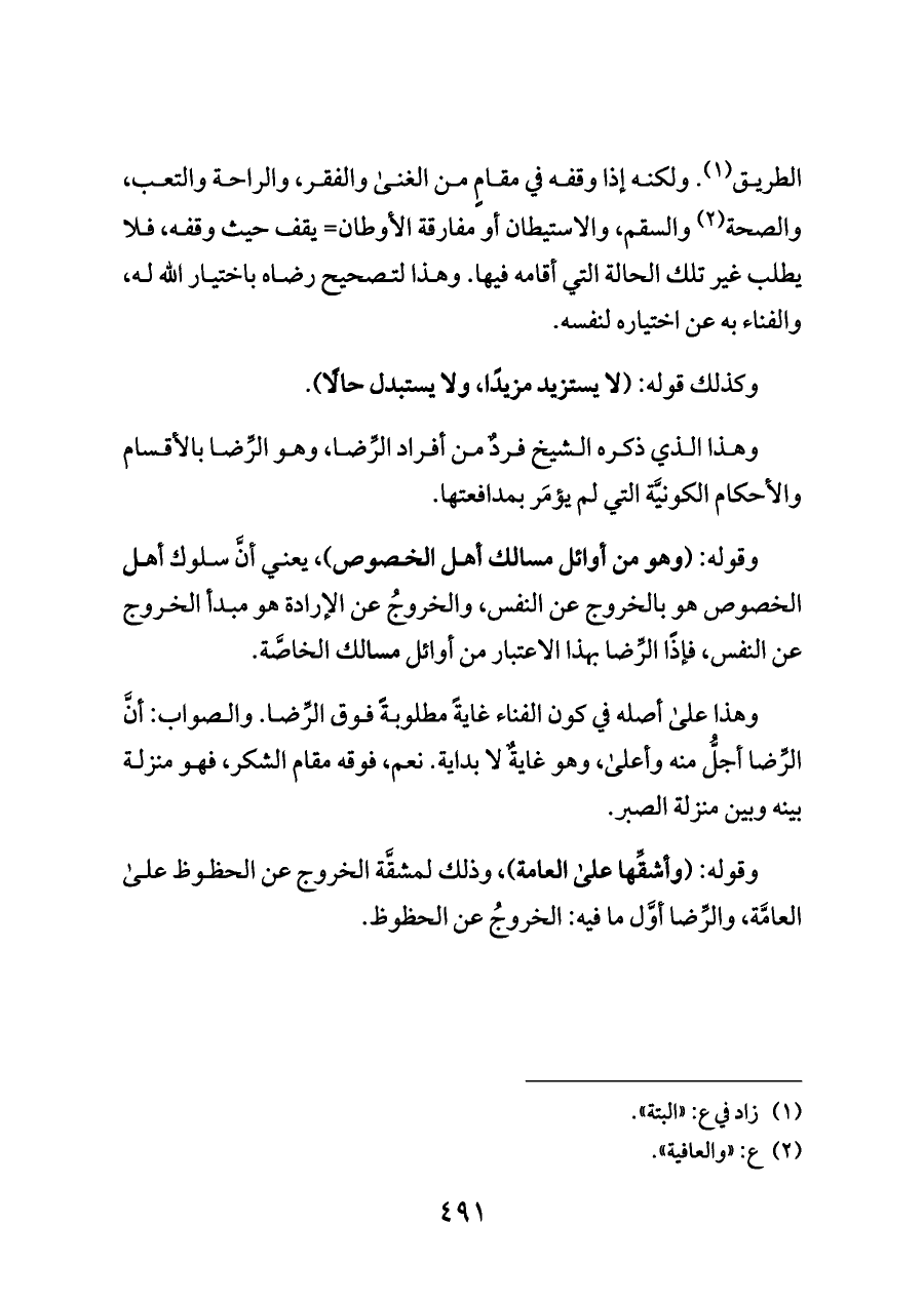 الطريق (¬١). ولكنه إذا وقفه في مقامٍ من الغنى والفقر، والراحة والتعب، والصحة (¬٢) والسقم، والاستيطان أو مفارقة الأوطان= يقف حيث وقفه، فلا يطلب غير تلك الحالة التي أقامه فيها. وهذا لتصحيح رضاه باختيار الله له، والفناء به عن اختياره لنفسه.