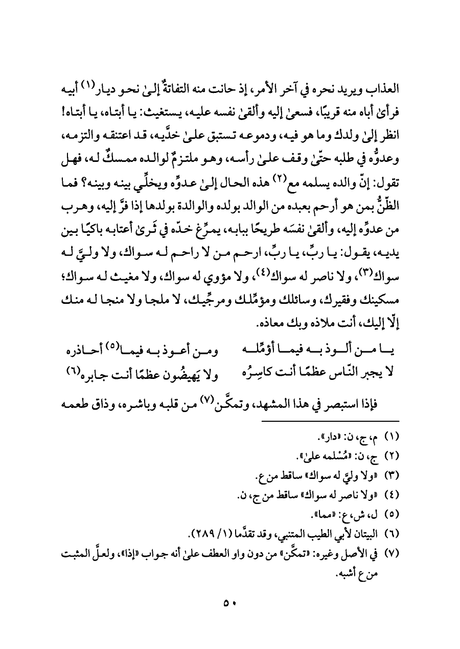 العذاب ويريد نحره في آخر الأمر، إذ حانت منه التفاتةٌ إلى نحو ديار (¬١) أبيه فرأى أباه منه قريبًا، فسعى إليه وألقى نفسه عليه، يستغيث: يا أبتاه، يا أبتاه! انظر إلى ولدك وما هو فيه، ودموعه تستبق على خدَّيه، قد اعتنقه والتزمه، وعدوُّه في طلبه حتّى وقف على رأسه، وهو ملتزمٌ لوالده ممسكٌ له، فهل تقول: إنّ والده يسلمه مع (¬٢) هذه الحال إلى عدوِّه ويخلِّي بينه وبينه؟ فما الظّنُّ بمن هو أرحم بعبده من الوالد بولده والوالدة بولدها إذا فرَّ إليه، وهرب من عدوِّه إليه، وألقى نفسَه طريحًا ببابه، يمرِّغ خدّه في ثَرى أعتابه باكيًا بين يديه، يقول: يا ربِّ، يا ربِّ، ارحم من لا راحم له سواك، ولا وليَّ له سواك (¬٣)، ولا ناصر له سواك (¬٤)، ولا مؤوي له سواك، ولا مغيث له سواك؛ مسكينك وفقيرك، وسائلك ومؤمِّلك ومرجِّيك، لا ملجا ولا منجا له منك إلّا إليك، أنت ملاذه وبك معاذه.