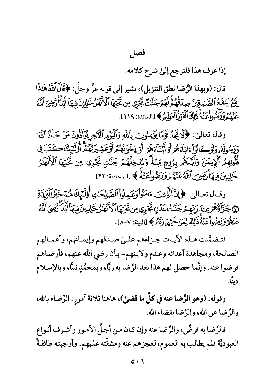 قال: (وبهذا الرِّضا نطق التنزيل)، يشير إلى قوله عزَّ وجلَّ: {قَالَ اللَّهُ هَذَا يَوْمُ يَنْفَعُ الصَّادِقِينَ صِدْقُهُمْ لَهُمْ جَنَّاتٌ تَجْرِي مِنْ تَحْتِهَا الْأَنْهَارُ خَالِدِينَ فِيهَا أَبَدًا رَضِيَ اللَّهُ عَنْهُمْ وَرَضُوا عَنْهُ ذَلِكَ الْفَوْزُ الْعَظِيمُ} [المائدة: ١١٩].