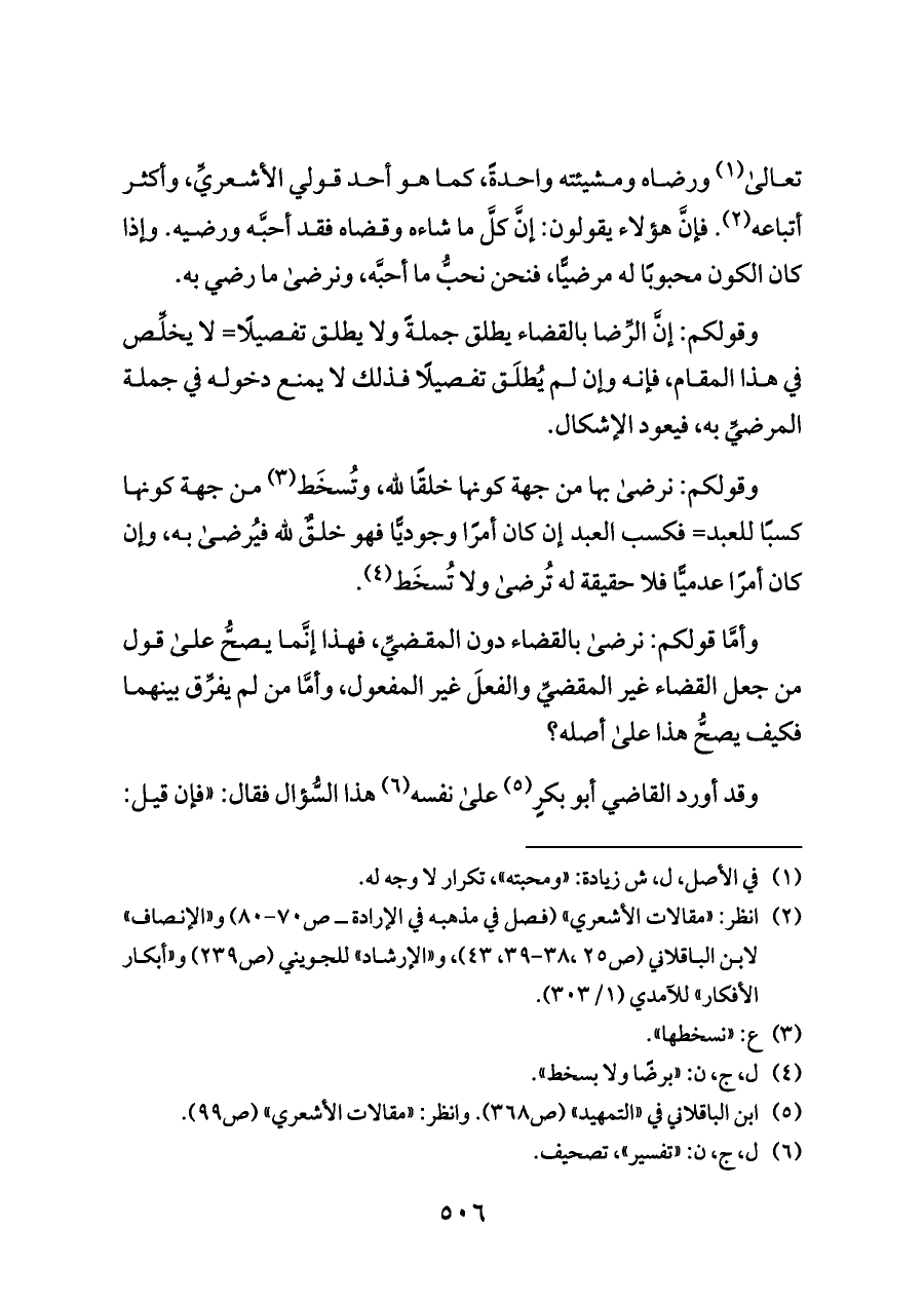 (¬٢) انظر: «مقالات الأشعري» (فصل في مذهبه في الإرادة ــ ص ٧٠ - ٨٠) و «الإنصاف» لابن الباقلاني (ص ٢٥،٣٨ - ٣٩، ٤٣)، و «الإرشاد» للجويني (ص ٢٣٩) و «أبكار الأفكار» للآمدي (١/ ٣٠٣).