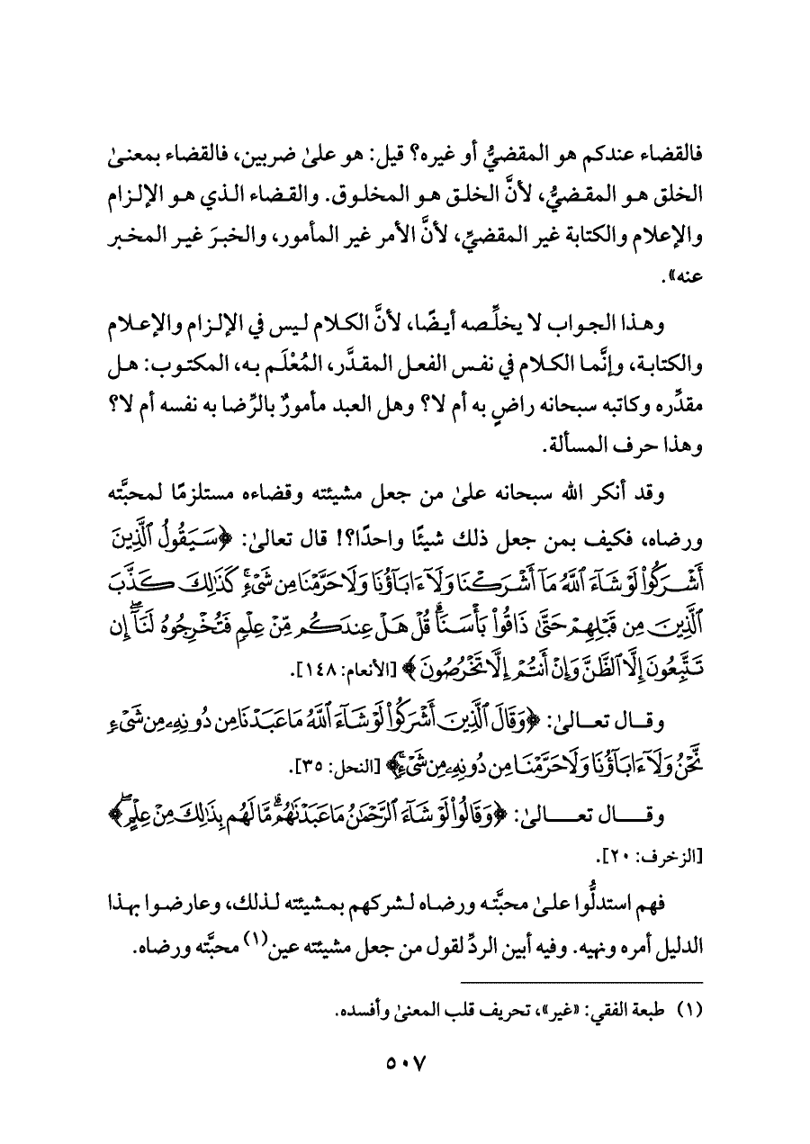 وقد أنكر الله سبحانه على من جعل مشيئته وقضاءه مستلزمًا لمحبَّته ورضاه، فكيف بمن جعل ذلك شيئًا واحدًا؟! قال تعالى: {سَيَقُولُ الَّذِينَ أَشْرَكُوا لَوْ شَاءَ اللَّهُ مَا أَشْرَكْنَا وَلَا آبَاؤُنَا وَلَا حَرَّمْنَا مِنْ شَيْءٍ كَذَلِكَ كَذَّبَ الَّذِينَ مِنْ قَبْلِهِمْ حَتَّى ذَاقُوا بَأْسَنَا قُلْ هَلْ عِنْدَكُمْ مِنْ عِلْمٍ فَتُخْرِجُوهُ لَنَا إِنْ تَتَّبِعُونَ إِلَّا الظَّنَّ وَإِنْ أَنْتُمْ إِلَّا تَخْرُصُونَ} [الأنعام: ١٤٨].