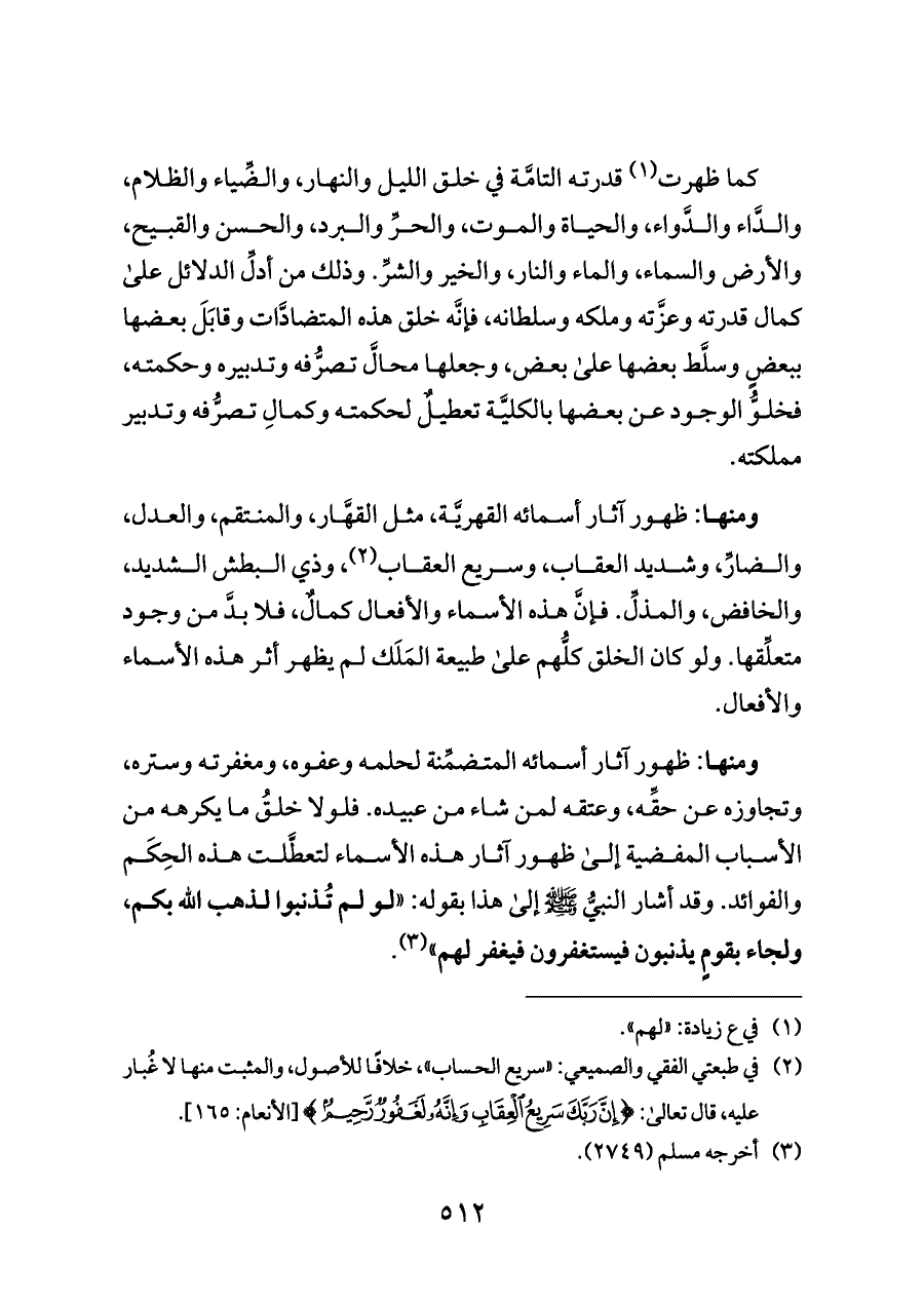 كما ظهرت (¬١) قدرته التامَّة في خلق الليل والنهار، والضِّياء والظلام، والدَّاء والدَّواء، والحياة والموت، والحرِّ والبرد، والحسن والقبيح، والأرض والسماء، والماء والنار، والخير والشرِّ. وذلك من أدلِّ الدلائل على كمال قدرته وعزَّته وملكه وسلطانه، فإنَّه خلق هذه المتضادَّات وقابَلَ بعضها ببعضٍ وسلَّط بعضها على بعض، وجعلها محالَّ تصرُّفه وتدبيره وحكمته، فخلوُّ الوجود عن بعضها بالكليَّة تعطيلٌ لحكمته وكمالِ تصرُّفه وتدبير مملكته.