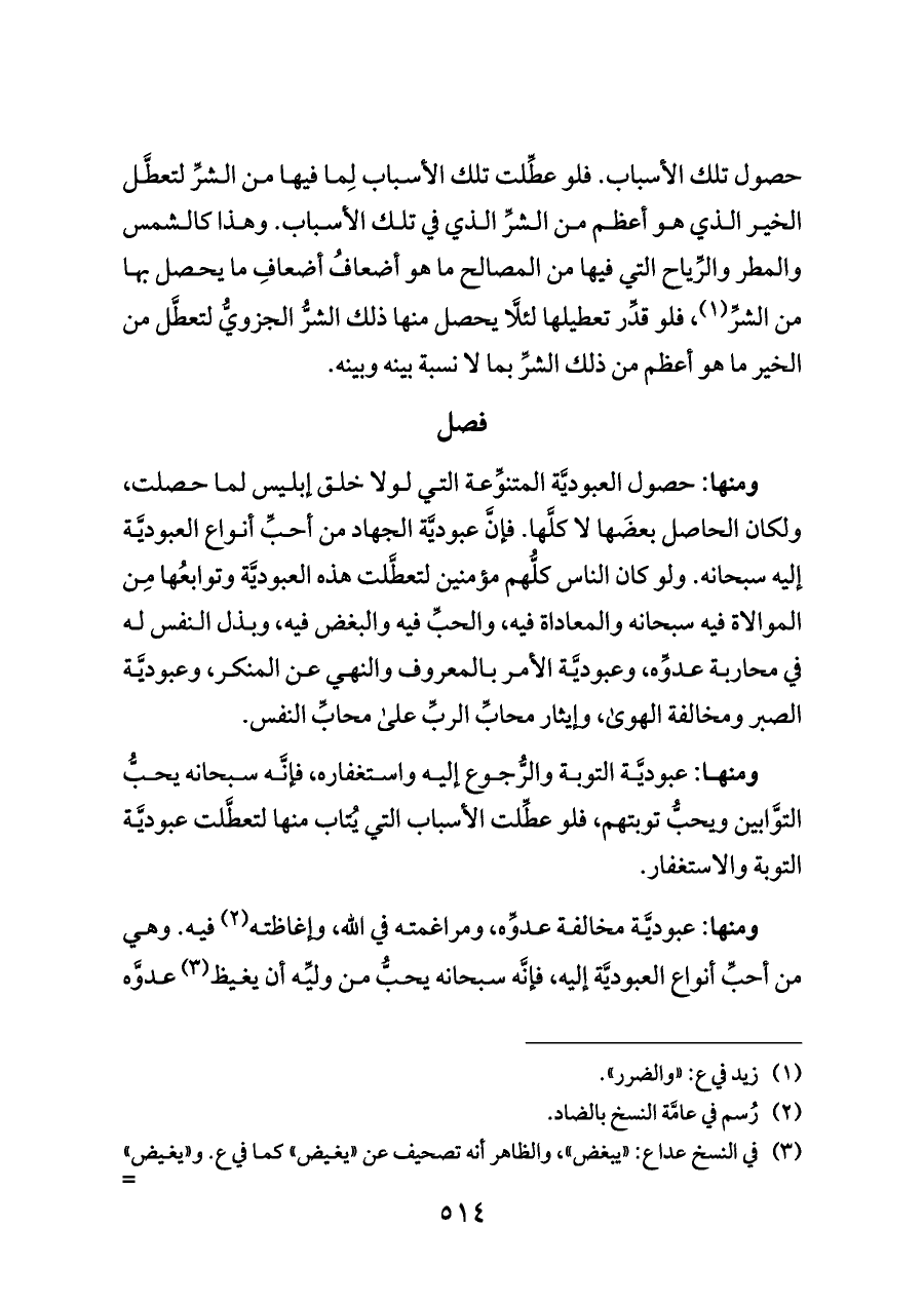 ومنها: حصول العبوديَّة المتنوِّعة التي لولا خلق إبليس لما حصلت، ولكان الحاصل بعضَها لا كلَّها. فإنَّ عبوديَّة الجهاد من أحبِّ أنواع العبوديَّة إليه سبحانه. ولو كان الناس كلُّهم مؤمنين لتعطَّلت هذه العبوديَّة وتوابعُها مِن الموالاة فيه سبحانه والمعاداة فيه، والحبِّ فيه والبغض فيه، وبذل النفس له في محاربة عدوِّه، وعبوديَّة الأمر بالمعروف والنهي عن المنكر، وعبوديَّة الصبر ومخالفة الهوى، وإيثار محابِّ الربِّ على محابِّ النفس.