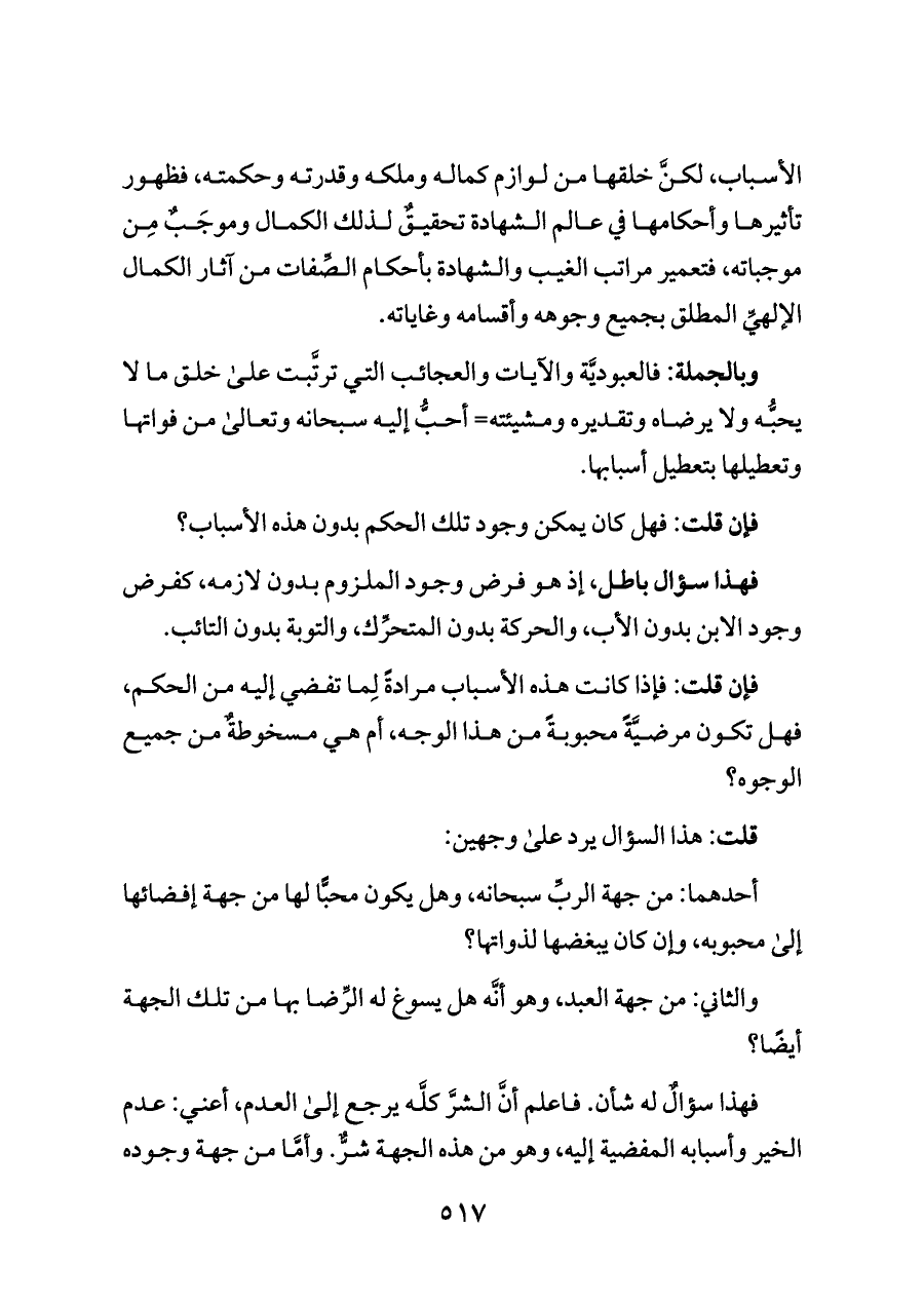 وبالجملة: فالعبوديَّة والآيات والعجائب التي ترتَّبت على خلق ما لا يحبُّه ولا يرضاه وتقديره ومشيئته= أحبُّ إليه سبحانه وتعالى من فواتها وتعطيلها بتعطيل أسبابها.