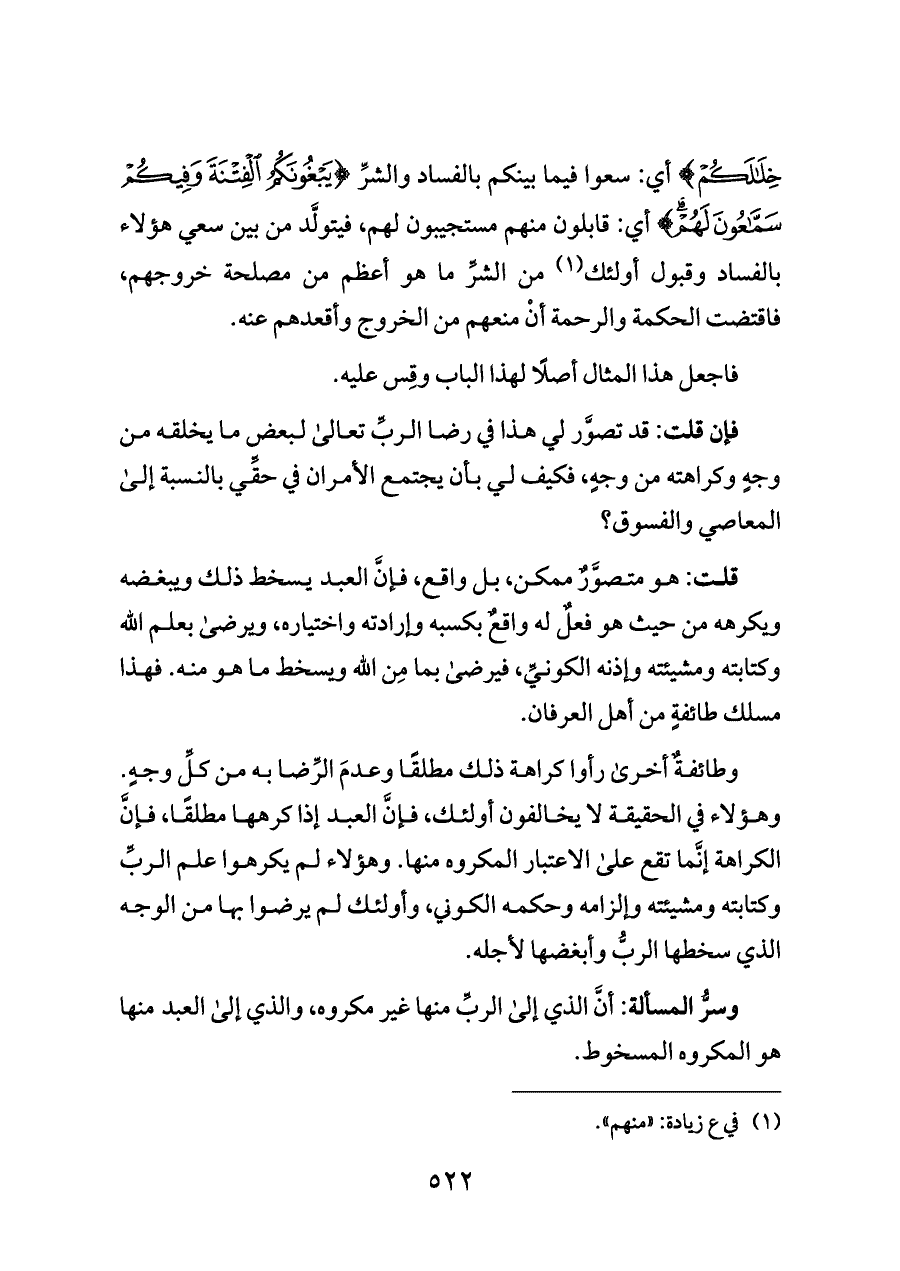 وسرُّ المسألة: أنَّ الذي إلى الربِّ منها غير مكروه، والذي إلى العبد منها هو المكروه المسخوط.