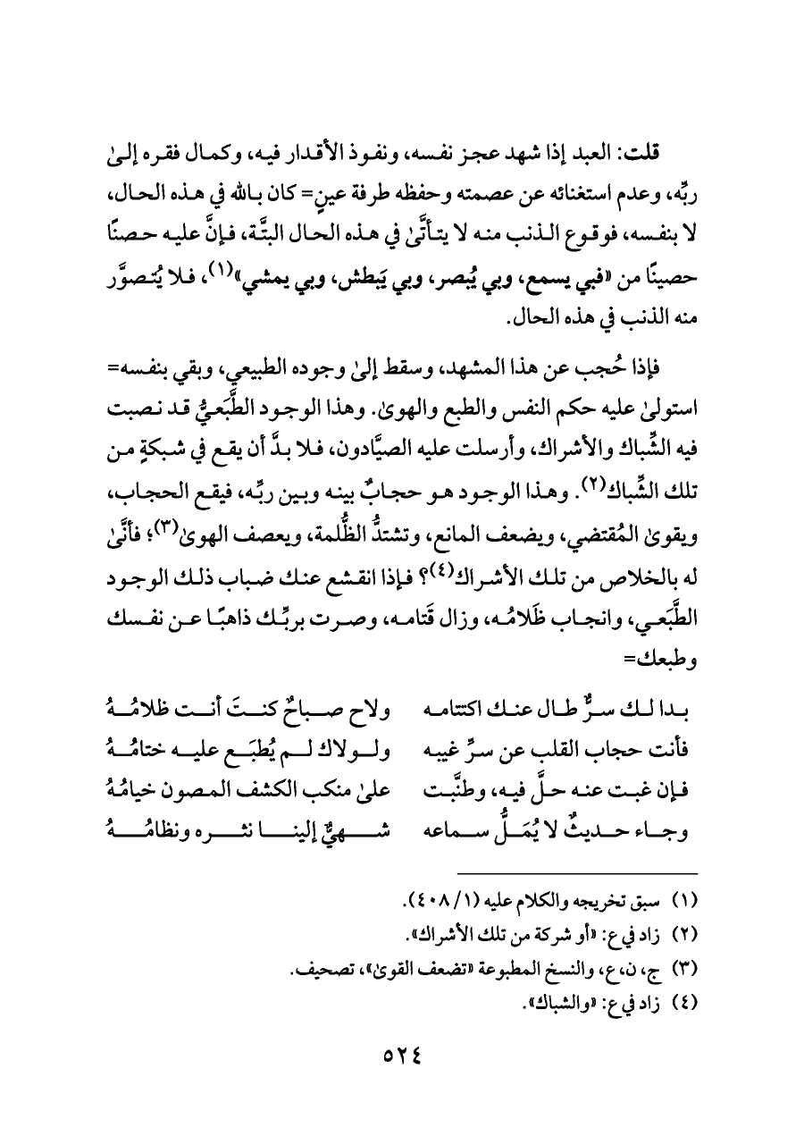 فإذا حُجب عن هذا المشهد، وسقط إلى وجوده الطبيعي، وبقي بنفسه= استولى عليه حكم النفس والطبع والهوى. وهذا الوجود الطَّبَعيُّ قد نصبت فيه الشِّباك والأشراك، وأرسلت عليه الصيَّادون، فلا بدَّ أن يقع في شبكةٍ من تلك الشِّباك (¬٢). وهذا الوجود هو حجابٌ بينه وبين ربِّه، فيقع الحجاب، ويقوى المُقتضي، ويضعف المانع، وتشتدُّ الظُّلمة، ويعصف الهوى (¬٣)؛ فأنَّى له بالخلاص من تلك الأشراك (¬٤)؟ فإذا انقشع عنك ضباب ذلك الوجود الطَّبَعي، وانجاب ظَلامُه، وزال قَتامه، وصرت بربِّك ذاهبًا عن نفسك وطبعك=