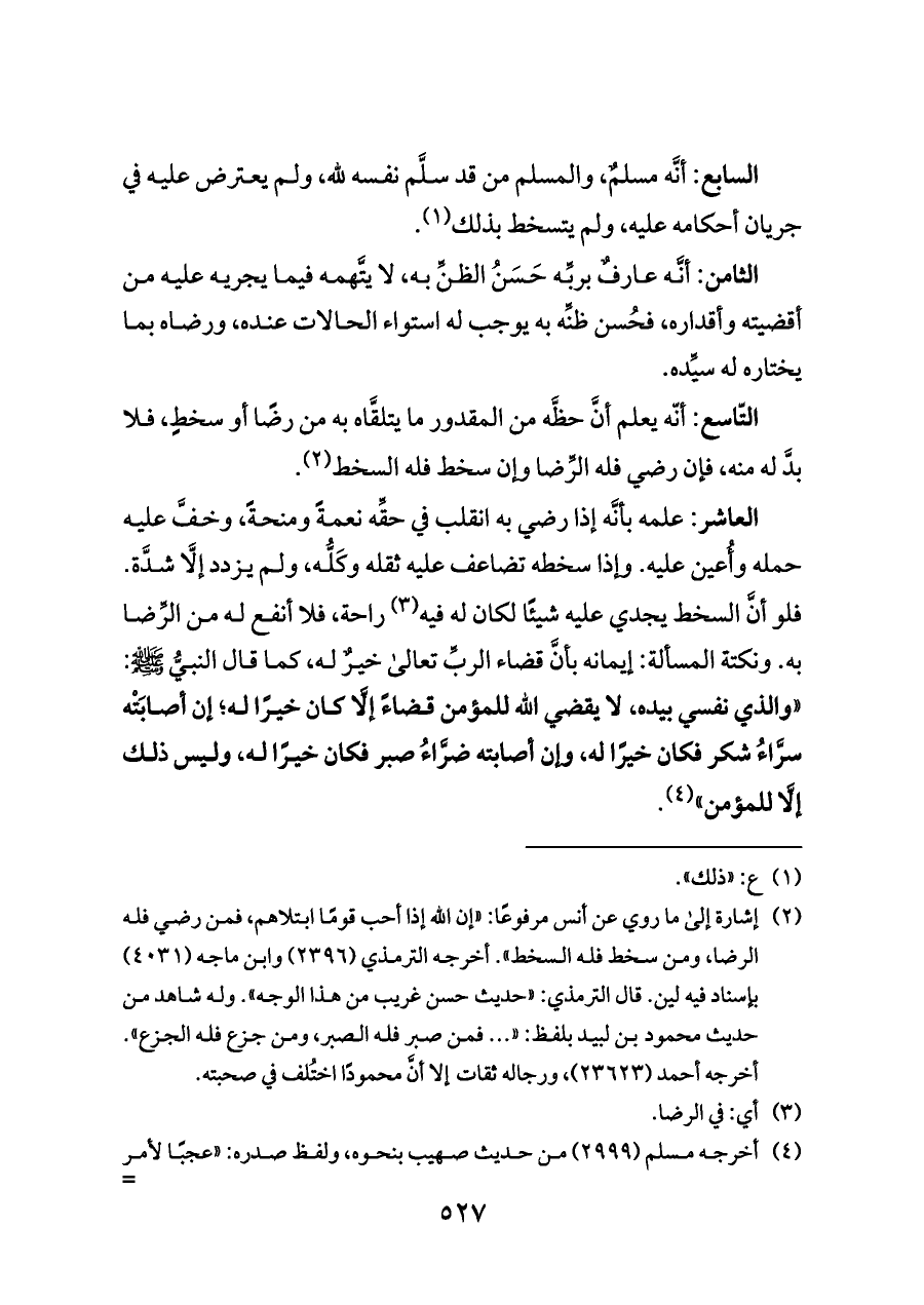 السابع: أنَّه مسلمٌ، والمسلم من قد سلَّم نفسه لله، ولم يعترض عليه في جريان أحكامه عليه، ولم يتسخط بذلك (¬١).