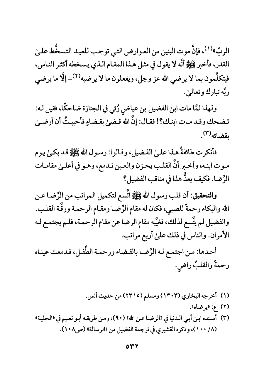 ولهذا لمَّا مات ابن الفضيل بن عياضٍ رُئي في الجنازة ضاحكًا، فقيل له: تضحك وقد مات ابنك؟! فقال: إنَّ الله قضى بقضاءٍ فأحببتُ أن أرضى بقضائه (¬٣).