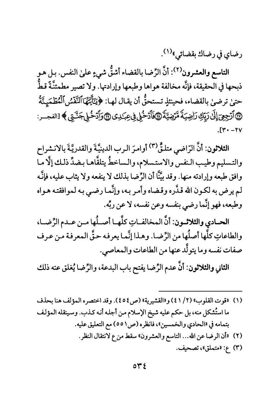التاسع والعشرون (¬٢): أنَّ الرِّضا بالقضاء أشقُّ شيءٍ على النفس. بل هو ذبحها في الحقيقة، فإنَّه مخالفة هواها وطبعها وإرادتها. ولا تصير مطمئنَّةً قطُّ حتى ترضى بالقضاء، فحينئذٍ تستحقُّ أن يقال لها: {يَاأَيَّتُهَا النَّفْسُ الْمُطْمَئِنَّةُ (٢٧) ارْجِعِي إِلَى رَبِّكِ رَاضِيَةً مَرْضِيَّةً (٢٨) فَادْخُلِي فِي عِبَادِي (٢٩) وَادْخُلِي جَنَّتِي} [الفجر: ٢٧ - ٣٠].
