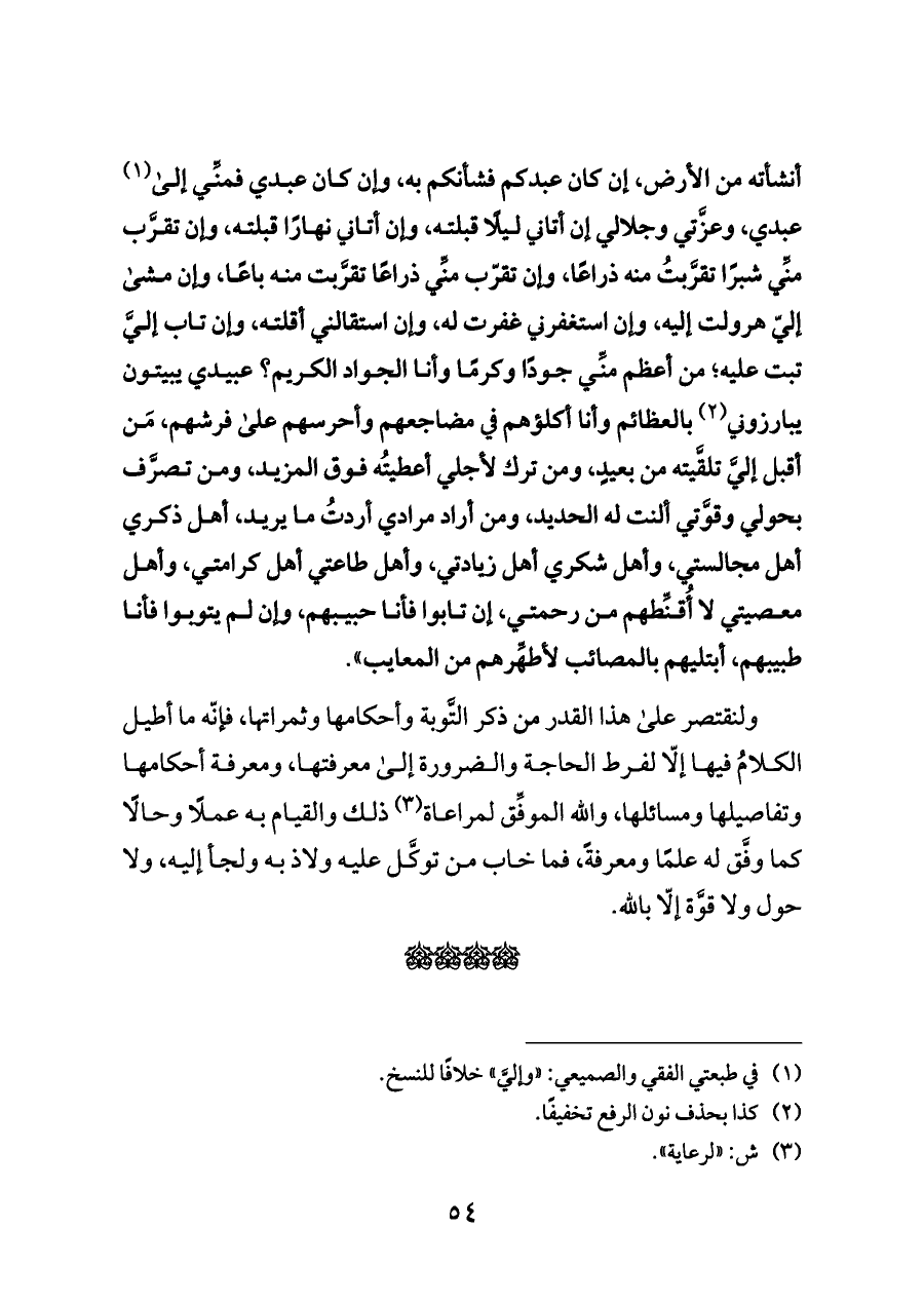 ولنقتصر على هذا القدر من ذكر التَّوبة وأحكامها وثمراتها، فإنّه ما أطيل الكلامُ فيها إلّا لفرط الحاجة والضرورة إلى معرفتها، ومعرفة أحكامها وتفاصيلها ومسائلها، والله الموفِّق لمراعاة (¬٣) ذلك والقيام به عملًا وحالًا كما وفَّق له علمًا ومعرفةً، فما خاب من توكَّل عليه ولاذ به ولجأ إليه، ولا حول ولا قوَّة إلّا بالله.
