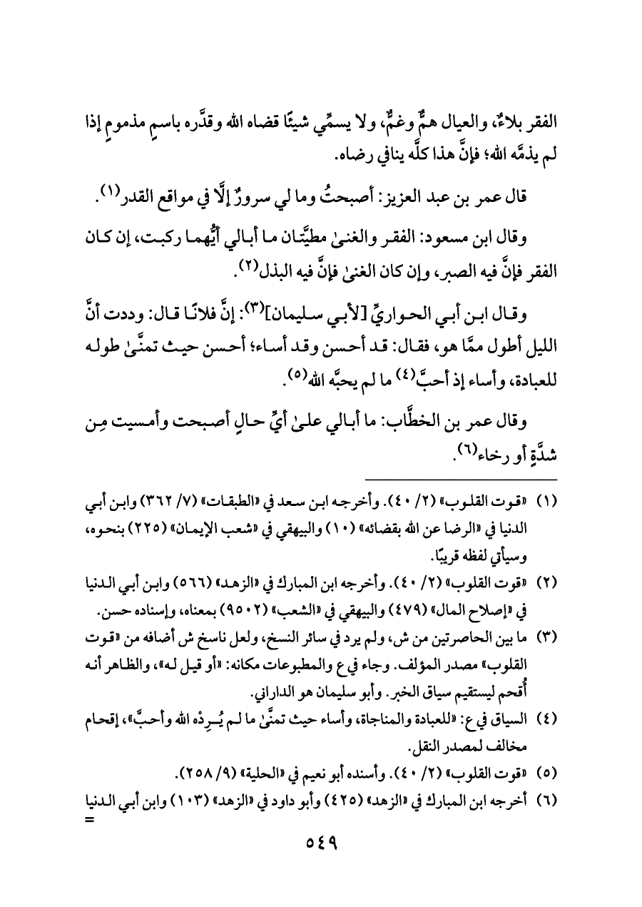 (¬١) «قوت القلوب» (٢/ ٤٠). وأخرجه ابن سعد في «الطبقات» (٧/ ٣٦٢) وابن أبي الدنيا في «الرضا عن الله بقضائه» (١٠) والبيهقي في «شعب الإيمان» (٢٢٥) بنحوه، وسيأتي لفظه قريبًا.