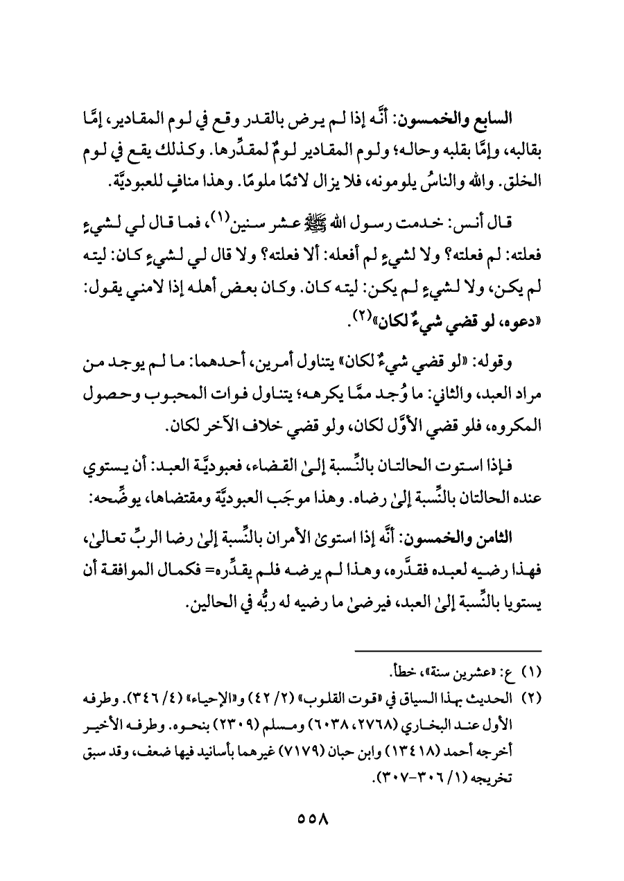 الثامن والخمسون: أنَّه إذا استوى الأمران بالنِّسبة إلى رضا الربِّ تعالى، فهذا رضيه لعبده فقدَّره، وهذا لم يرضه فلم يقدِّره= فكمال الموافقة أن يستويا بالنِّسبة إلى العبد، فيرضى ما رضيه له ربُّه في الحالين.