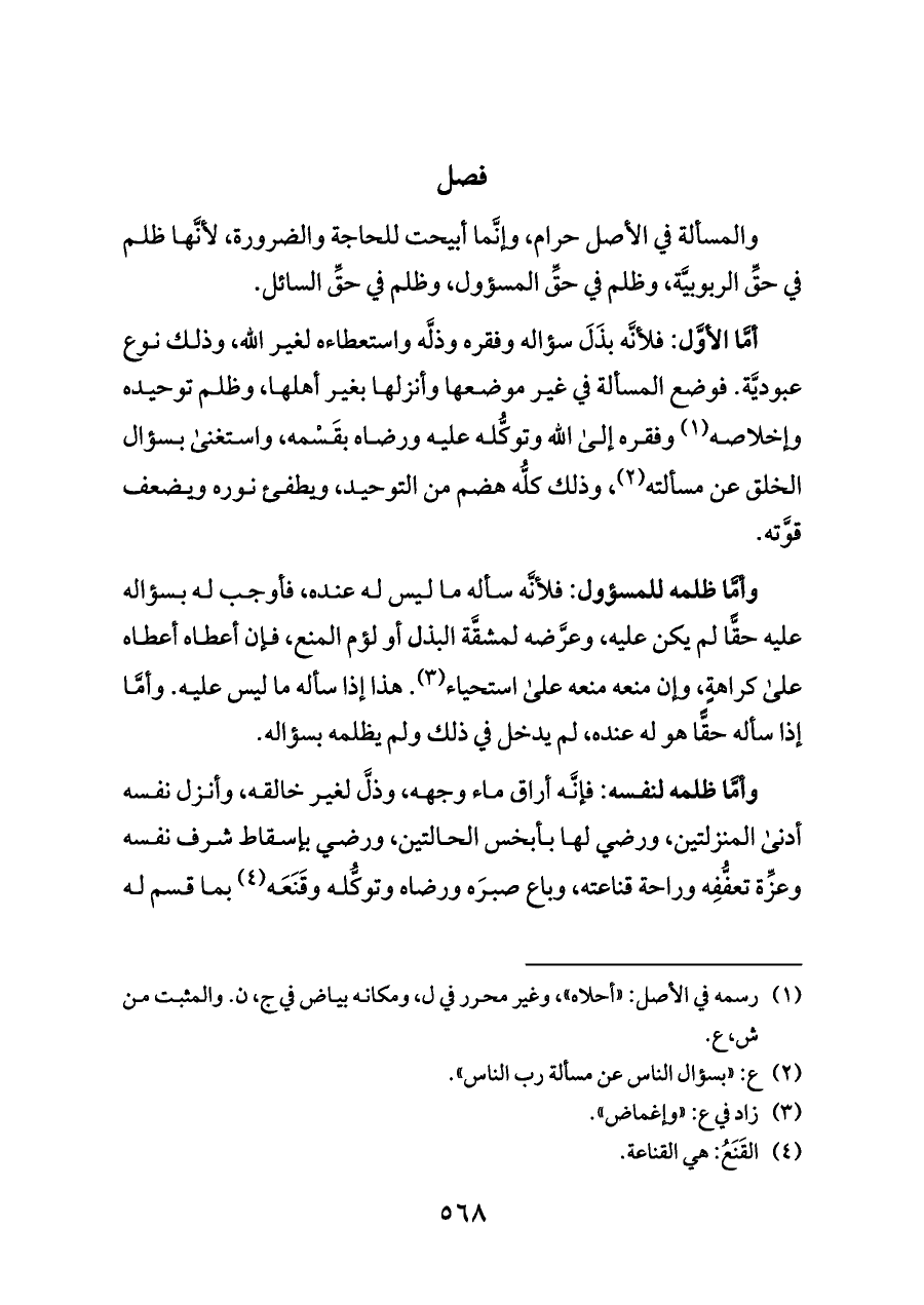 وأمَّا ظلمه للمسؤول: فلأنَّه سأله ما ليس له عنده، فأوجب له بسؤاله عليه حقًّا لم يكن عليه، وعرَّضه لمشقَّة البذل أو لؤم المنع، فإن أعطاه أعطاه على كراهةٍ، وإن منعه منعه على استحياء (¬٣). هذا إذا سأله ما ليس عليه. وأمَّا إذا سأله حقًّا هو له عنده، لم يدخل في ذلك ولم يظلمه بسؤاله.