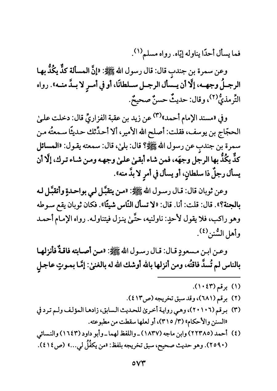وفي «مسند الإمام أحمد» (¬٣) عن زيد بن عقبة الفزاريِّ قال: دخلت على الحجّاج بن يوسف، فقلت: أصلح الله الأمير، ألا أحدِّثك حديثًا سمعتُه من سمرة بن جندبٍ عن رسول الله - صلى الله عليه وسلم -؟ قال: بلى، قال: سمعته يقول: «المسائل كدٌّ يكُدُّ بها الرجل وجهَه، فمن شاء أبقى على وجهه ومن شاء ترك، إلَّا أن يسأل رجلٌ ذا سلطانٍ، أو يسأل في أمرٍ لا بدَّ منه».