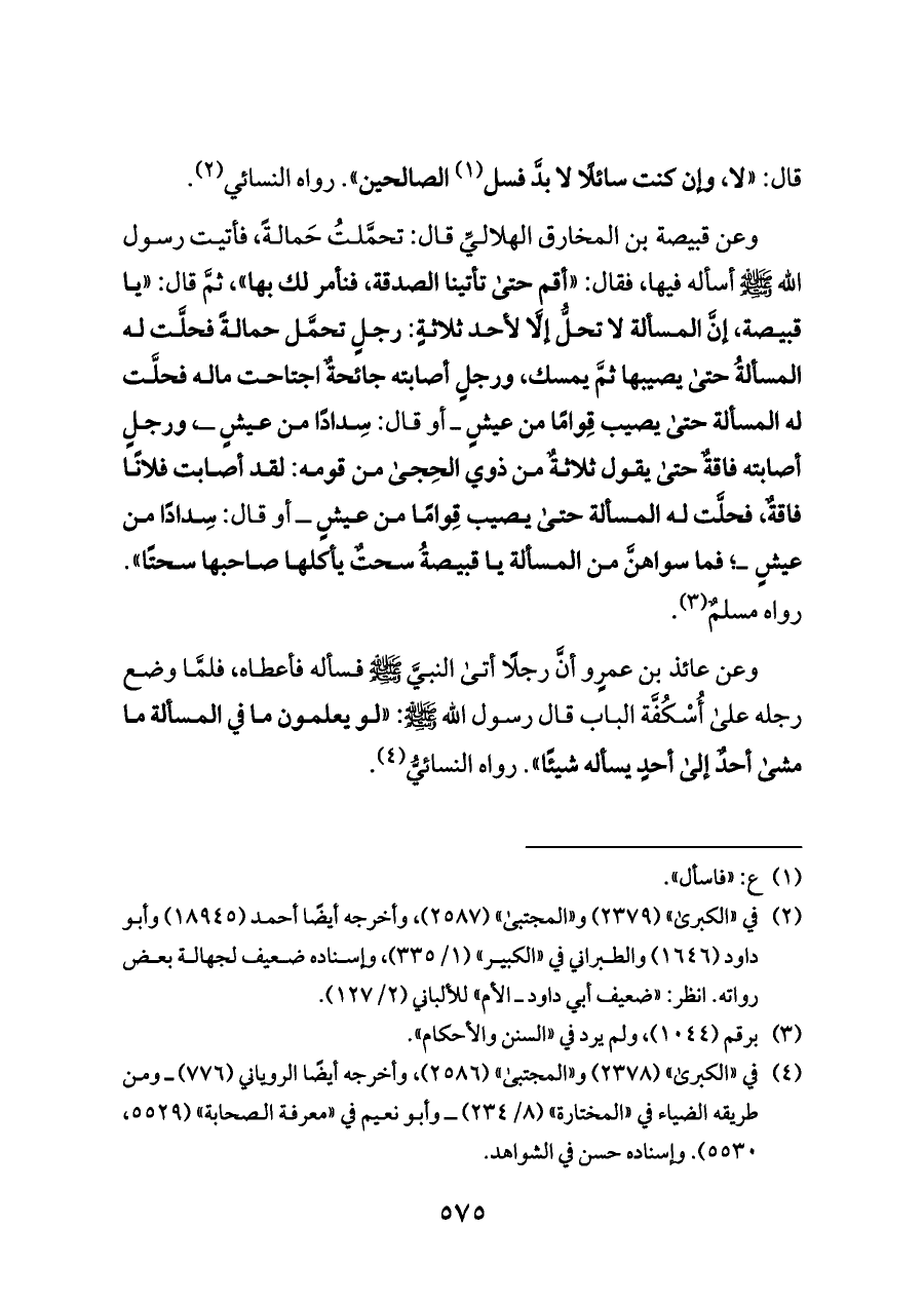 وعن قبيصة بن المخارق الهلاليِّ قال: تحمَّلتُ حَمالةً، فأتيت رسول الله - صلى الله عليه وسلم - أسأله فيها، فقال: «أقم حتى تأتينا الصدقة، فنأمر لك بها»، ثمَّ قال: «يا قبيصة، إنَّ المسألة لا تحلُّ إلَّا لأحد ثلاثةٍ: رجلٍ تحمَّل حمالةً فحلَّت له المسألةُ حتى يصيبها ثمَّ يمسك، ورجلٍ أصابته جائحةٌ اجتاحت ماله فحلَّت له المسألة حتى يصيب قِوامًا من عيشٍ ــ أو قال: سِدادًا من عيشٍ ــ، ورجلٍ أصابته فاقةٌ حتى يقول ثلاثةٌ من ذوي الحِجى من قومه: لقد أصابت فلانًا فاقةٌ، فحلَّت له المسألة حتى يصيب قِوامًا من عيشٍ ــ أو قال: سِدادًا من عيشٍ ــ؛ فما سواهنَّ من المسألة يا قبيصةُ سحتٌ يأكلها صاحبها سحتًا». رواه مسلمٌ (¬٤).