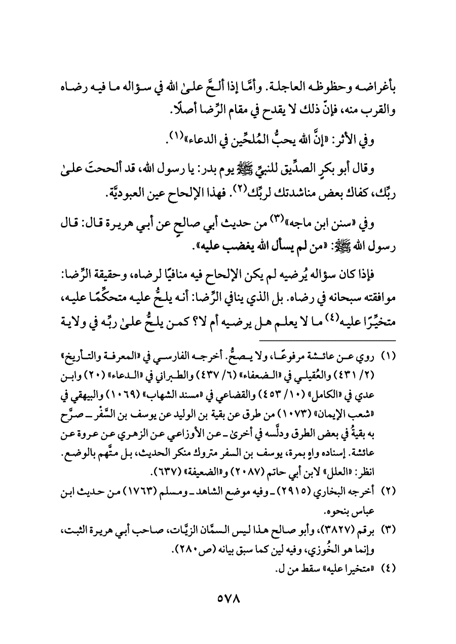 فإذا كان سؤاله يُرضيه لم يكن الإلحاح فيه منافيًا لرضاه، وحقيقة الرِّضا: موافقته سبحانه في رضاه. بل الذي ينافي الرِّضا: أنه يلحُّ عليه متحكِّمًا عليه، متخيِّرًا عليه (¬٤) ما لا يعلم هل يرضيه أم لا؟ كمن يلحُّ على ربِّه في ولاية