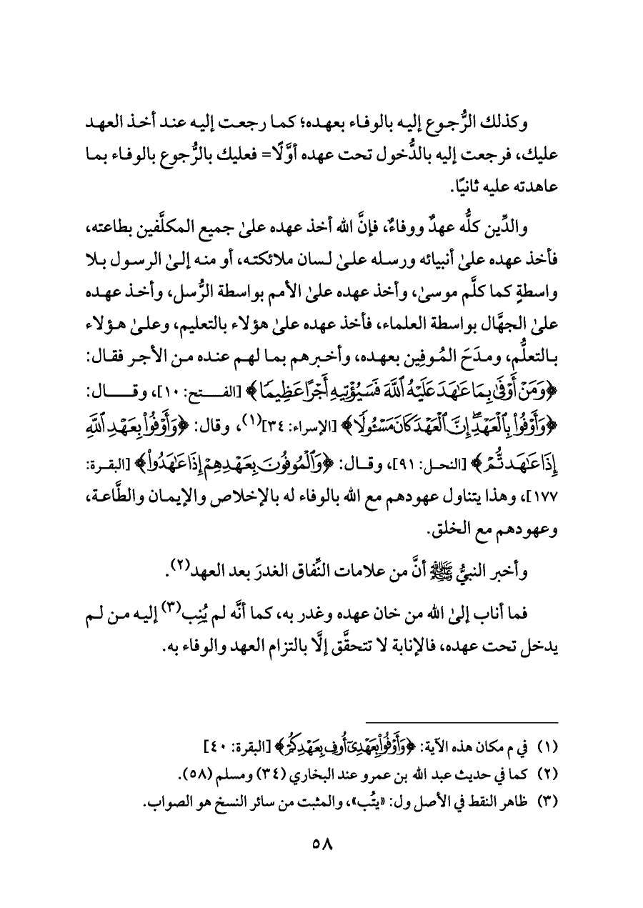 والدِّين كلُّه عهدٌ ووفاءٌ، فإنَّ الله أخذ عهده على جميع المكلَّفين بطاعته، فأخذ عهده على أنبيائه ورسله على لسان ملائكته، أو منه إلى الرسول بلا واسطةٍ كما كلَّم موسى، وأخذ عهده على الأمم بواسطة الرُّسل، وأخذ عهده على الجهَّال بواسطة العلماء، فأخذ عهده على هؤلاء بالتعليم، وعلى هؤلاء بالتعلُّم، ومدَحَ المُوفِين بعهده، وأخبرهم بما لهم عنده من الأجر فقال: {وَمَنْ أَوْفَى بِمَا عَاهَدَ عَلَيْهُ اللَّهَ فَسَيُؤْتِيهِ أَجْرًا عَظِيمًا} [الفتح: ١٠]، وقال: {وَأَوْفُوا بِالْعَهْدِ إِنَّ الْعَهْدَ كَانَ مَسْئُولًا} [الإسراء: ٣٤] (¬١)، وقال: {وَأَوْفُوا بِعَهْدِ اللَّهِ إِذَا عَاهَدْتُمْ} [النحل: ٩١]، وقال: {وَالْمُوفُونَ بِعَهْدِهِمْ إِذَا عَاهَدُوا} [البقرة: ١٧٧]، وهذا يتناول عهودهم مع الله بالوفاء له بالإخلاص والإيمان والطَّاعة، وعهودهم مع الخلق.