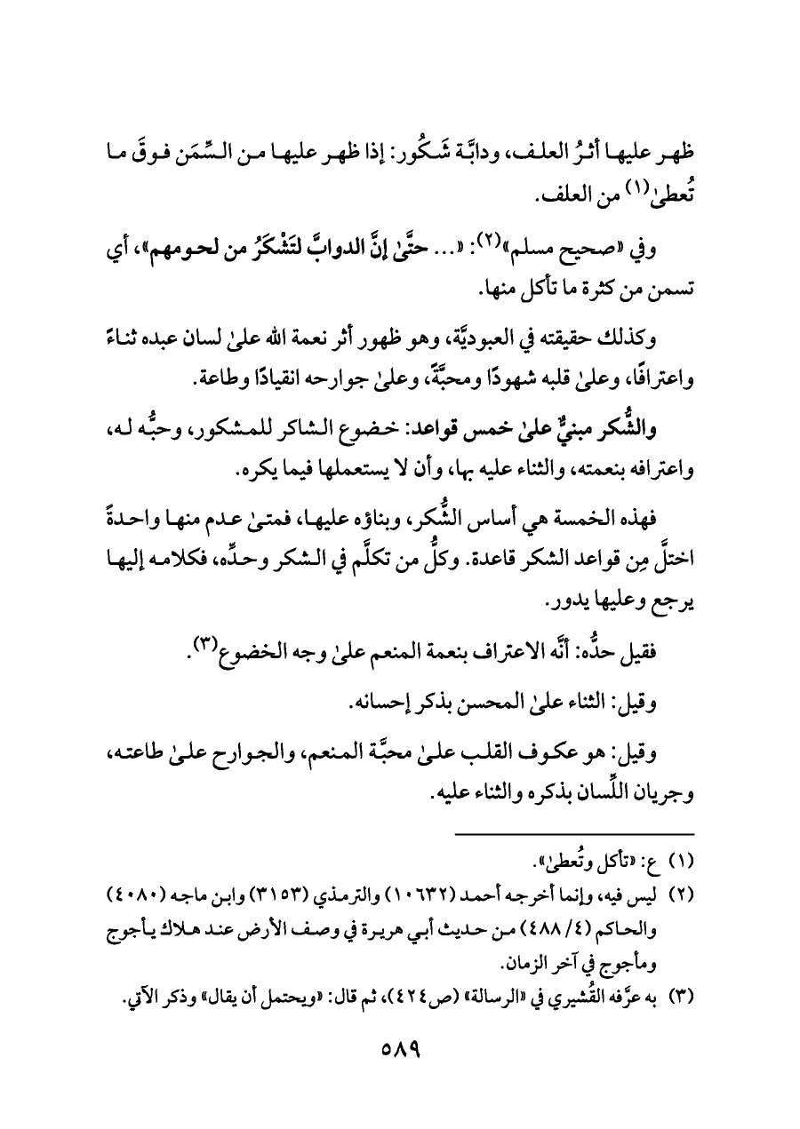 فهذه الخمسة هي أساس الشُّكر، وبناؤه عليها، فمتى عدم منها واحدةً اختلَّ مِن قواعد الشكر قاعدة. وكلُّ من تكلَّم في الشكر وحدِّه، فكلامه إليها يرجع وعليها يدور.