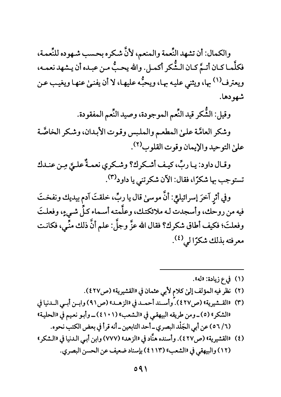 والكمال: أن تشهد النِّعمة والمنعم، لأنَّ شكره بحسب شهوده للنِّعمة، فكلَّما كان أتمَّ كان الشُّكر أكمل. والله يحبُّ من عبده أن يشهد نعمه، ويعترف (¬١) بها، ويثني عليه بها، ويحبُّه عليها، لا أن يفنى عنها ويغيب عن شهودها.