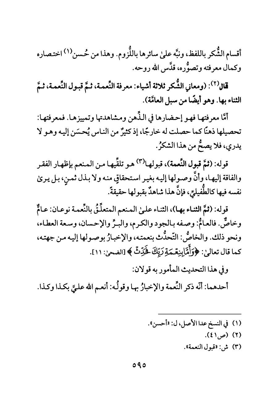 قال (¬٢): (ومعاني الشُّكر ثلاثة أشياء: معرفة النِّعمة، ثمَّ قبول النِّعمة، ثمَّ الثناء بها. وهو أيضًا من سبل العامَّة).