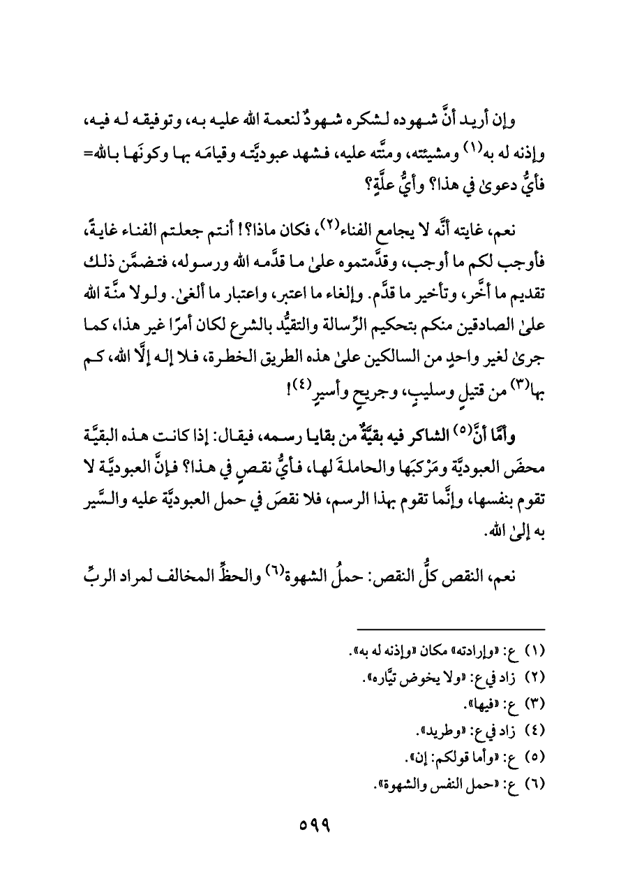 نعم، غايته أنَّه لا يجامع الفناء (¬٢)، فكان ماذا؟! أنتم جعلتم الفناء غايةً، فأوجب لكم ما أوجب، وقدَّمتموه على ما قدَّمه الله ورسوله، فتضمَّن ذلك تقديم ما أخَّر، وتأخير ما قدَّم. وإلغاء ما اعتبر، واعتبار ما ألغى. ولولا منَّة الله على الصادقين منكم بتحكيم الرِّسالة والتقيُّد بالشرع لكان أمرًا غير هذا، كما جرى لغير واحدٍ من السالكين على هذه الطريق الخطرة، فلا إله إلَّا الله، كم بها (¬٣) من قتيلٍ وسليبٍ، وجريحٍ وأسيرٍ (¬٤)!