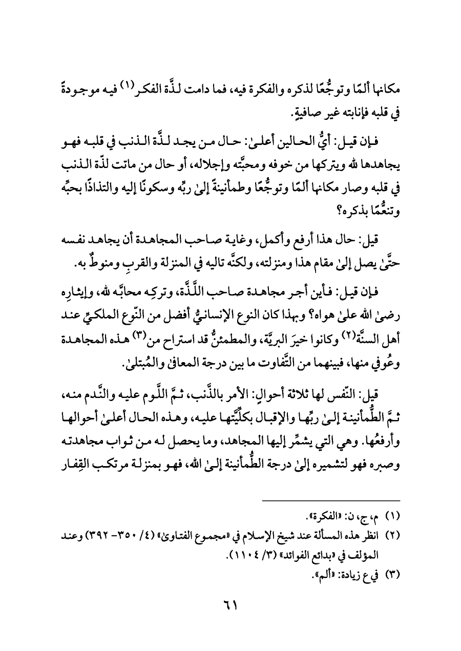 فإن قيل: أيُّ الحالين أعلى: حال من يجد لذَّة الذنب في قلبه فهو يجاهدها لله ويتركها من خوفه ومحبَّته وإجلاله، أو حال من ماتت لذّة الذنب في قلبه وصار مكانها ألمًا وتوجُّعًا وطمأنينةً إلى ربِّه وسكونًا إليه والتذاذًا بحبِّه وتنعُّمًا بذكره؟