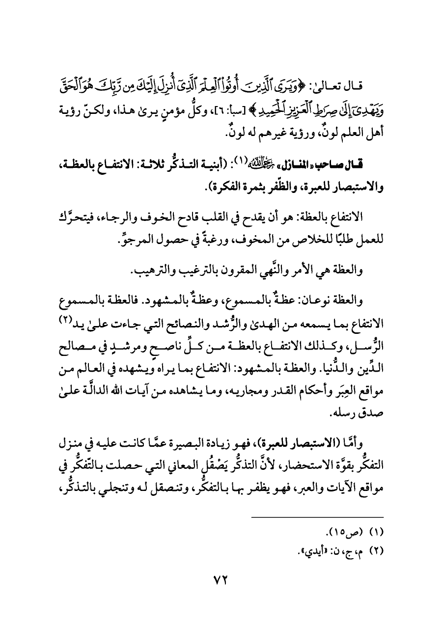 قال صاحب «المنازل» - رحمه الله - (¬١): (أبنية التذكُّر ثلاثة: الانتفاع بالعظة، والاستبصار للعبرة، والظّفر بثمرة الفكرة).