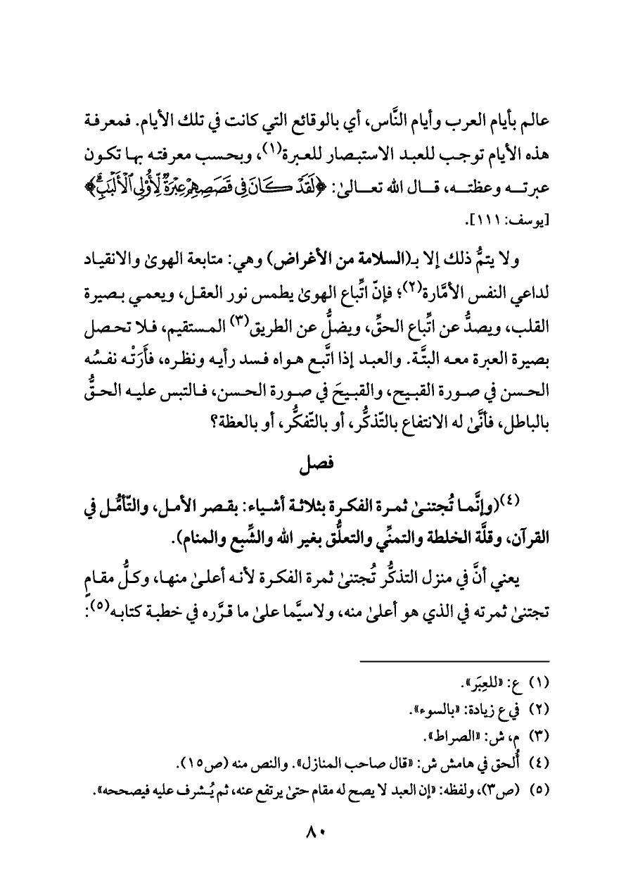 فصل (¬٤) (وإنَّما تُجتنى ثمرة الفكرة بثلاثة أشياء: بقصر الأمل، والتّأمُّل في القرآن، وقلَّة الخلطة والتمنِّي والتعلُّق بغير الله والشِّبع والمنام).