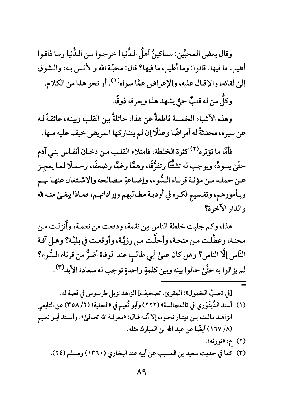 (¬١) أسند الدِّينَوَري في «المجالسة» (٢٢٢) وأبو نُعيم في «الحلية» (٢/ ٣٥٨) عن التابعي الزاهد مالك بن دينار نحوه، إلا أنه قال: «معرفة الله تعالى». وأسند أبو نعيم (٨/ ١٦٧) أيضًا عن عبد الله بن المبارك مثله.