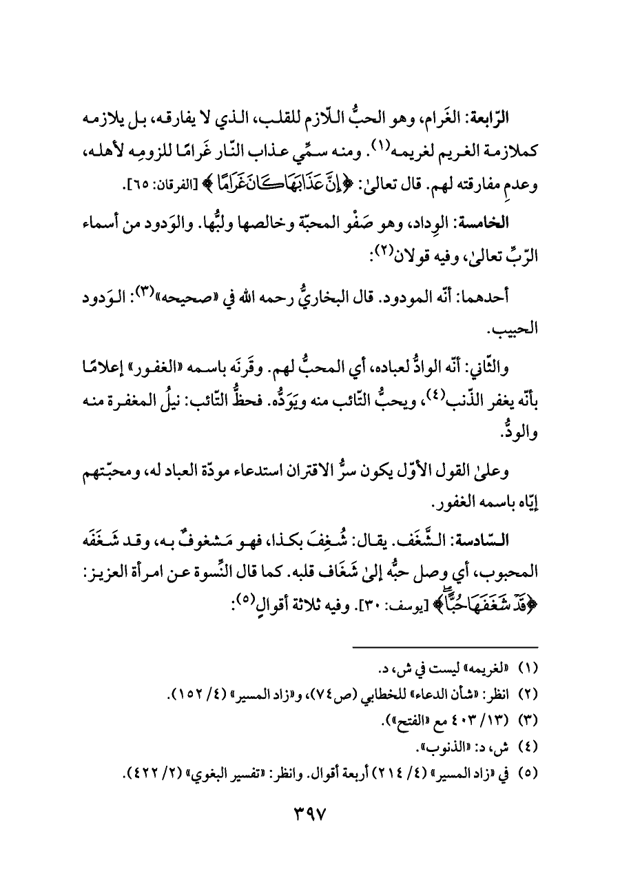 الرّابعة: الغَرام، وهو الحبُّ اللّازم للقلب، الذي لا يفارقه، بل يلازمه كملازمة الغريم لغريمه (¬١). ومنه سمِّي عذاب النّار غَرامًا للزومِه لأهله، وعدمِ مفارقته لهم. قال تعالى: {عَذَابَهَا كَانَ غَرَامًا (٦٥)} [الفرقان: ٦٥].