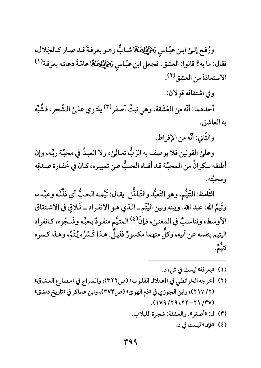 أحدهما: أنّه من العَشَقة، وهي نبتٌ أصفر (¬٣) يلتوي على الشّجر، فشُبِّه به العاشق.