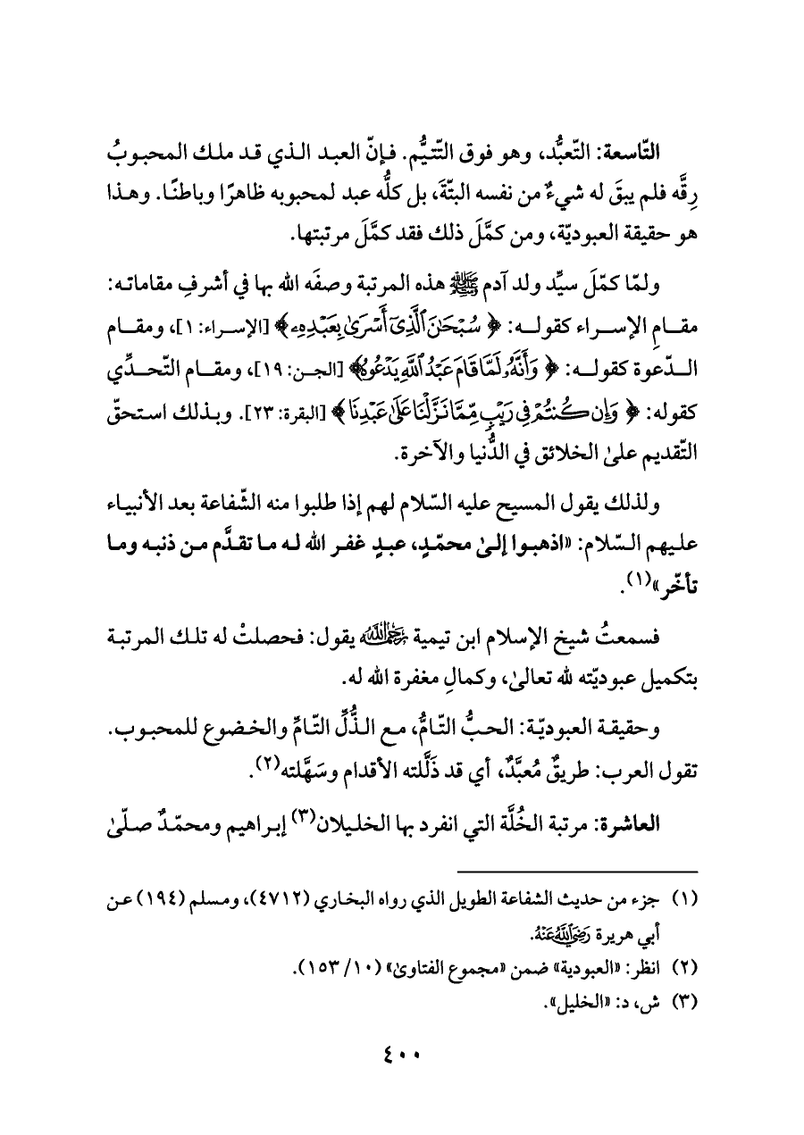 ولمّا كمّلَ سيِّد ولد آدم - صلى الله عليه وسلم - هذه المرتبة وصفَه الله بها في أشرفِ مقاماته: مقامِ الإسراء كقوله: {سُبْحَانَ الَّذِي أَسْرَى بِعَبْدِهِ} [الإسراء: ١]، ومقام الدّعوة كقوله: {وَأَنَّهُ لَمَّا قَامَ عَبْدُ اللَّهِ يَدْعُوهُ} [الجن: ١٩]، ومقام التّحدِّي كقوله: {وَإِنْ كُنْتُمْ فِي رَيْبٍ مِمَّا نَزَّلْنَا عَلَى عَبْدِنَا} [البقرة: ٢٣]. وبذلك استحقّ التّقديم على الخلائق في الدُّنيا والآخرة.