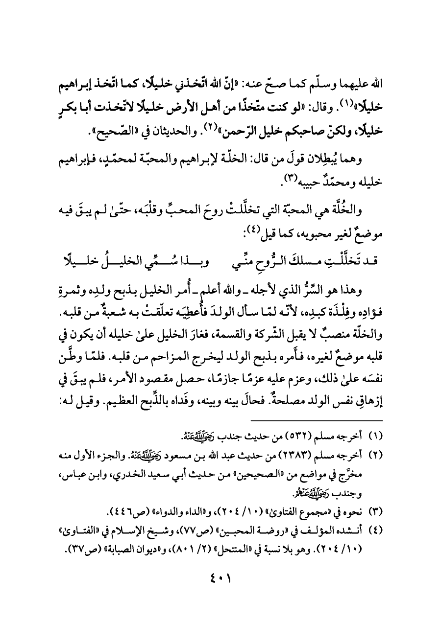 وهذا هو السِّرُّ الذي لأجله ــ والله أعلم ــ أُمر الخليل بذبح ولدِه وثمرةِ فؤادِه وفِلْذَة كبدِه، لأنّه لمّا سأل الولدَ فأُعطِيَه تعلّقتْ به شعبةٌ من قلبه. والخلّة منصبٌ لا يقبل الشّركة والقسمة، فغارَ الخليل على خليله أن يكون في قلبه موضعٌ لغيره، فأَمره بذبح الولد ليخرج المزاحم من قلبه. فلمّا وطَّن نفسَه على ذلك، وعزم عليه عزمًا جازمًا، حصل مقصود الأمر، فلم يبقَ في إزهاقِ نفس الولد مصلحةٌ. فحالَ بينه وبينه، وفَداه بالذِّبح العظيم. وقيل له: