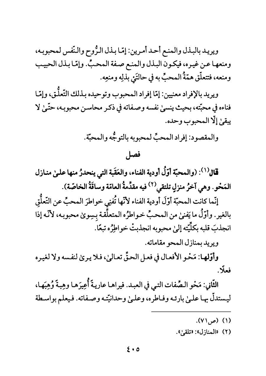قال (¬١): (والمحبّة أوّلُ أودية الفناء، والعَقَبة التي ينحدرُ منها على منازل المَحْو. وهي آخرُ منزلٍ تلتقي (¬٢) فيه مقدِّمةُ العامّة وساقَةُ الخاصّة).