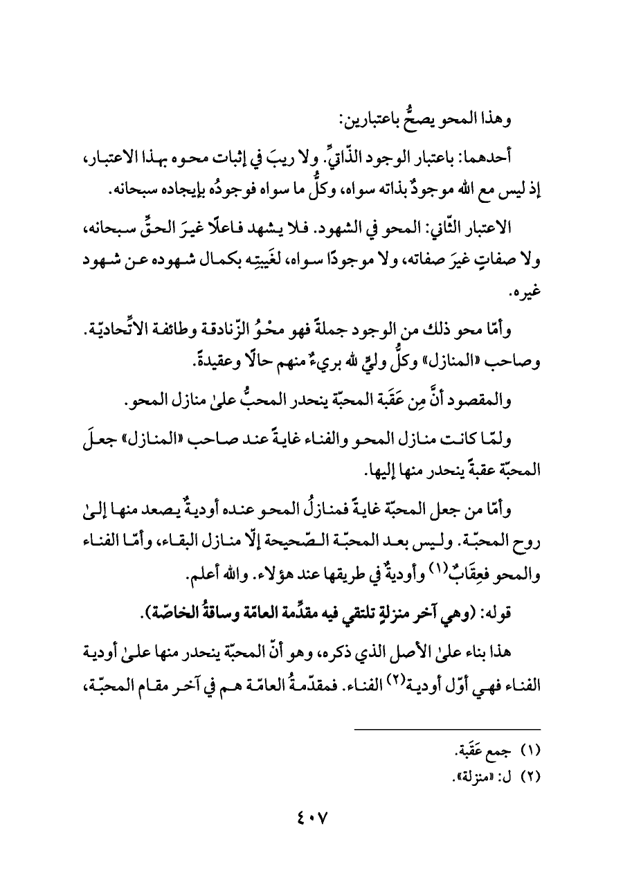 وأمّا محو ذلك من الوجود جملةً فهو محْوُ الزّنادقة وطائفة الاتِّحاديّة. وصاحب «المنازل» وكلُّ وليٍّ لله بريءٌ منهم حالًا وعقيدةً.