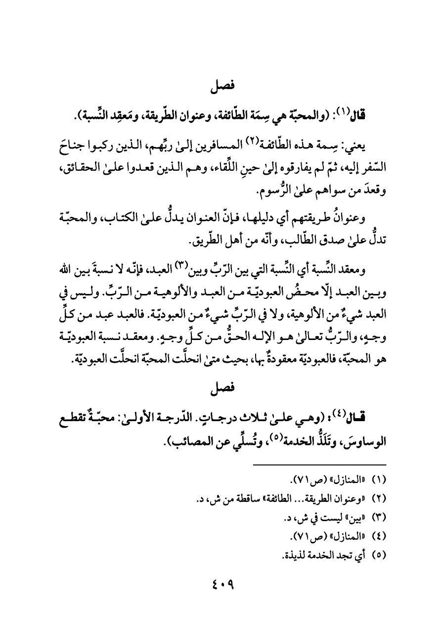 قال (¬١): (والمحبّة هي سِمَة الطّائفة، وعنوان الطّريقة، ومَعقِد النِّسبة).