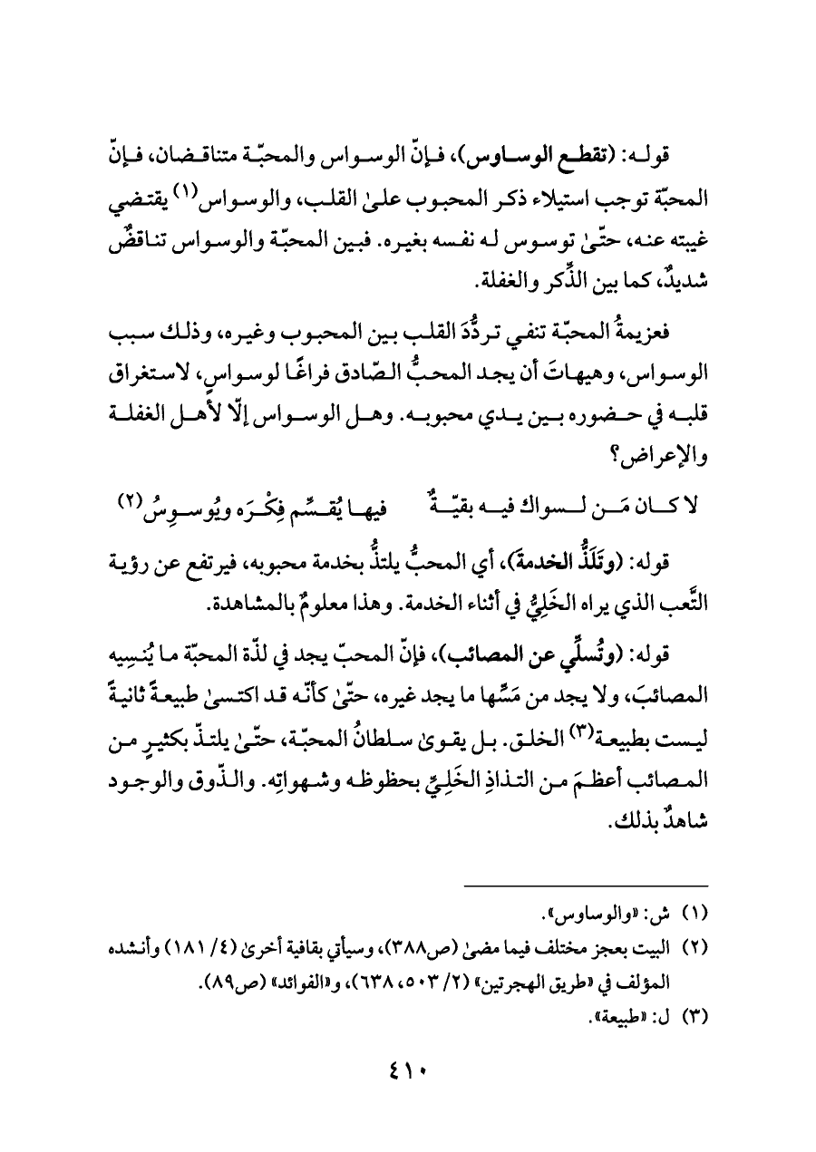 قوله: (تقطع الوساوس)، فإنّ الوسواس والمحبّة متناقضان، فإنّ المحبّة توجب استيلاء ذكر المحبوب على القلب، والوسواس (¬١) يقتضي غيبته عنه، حتّى توسوس له نفسه بغيره. فبين المحبّة والوسواس تناقضٌ شديدٌ، كما بين الذِّكر والغفلة.