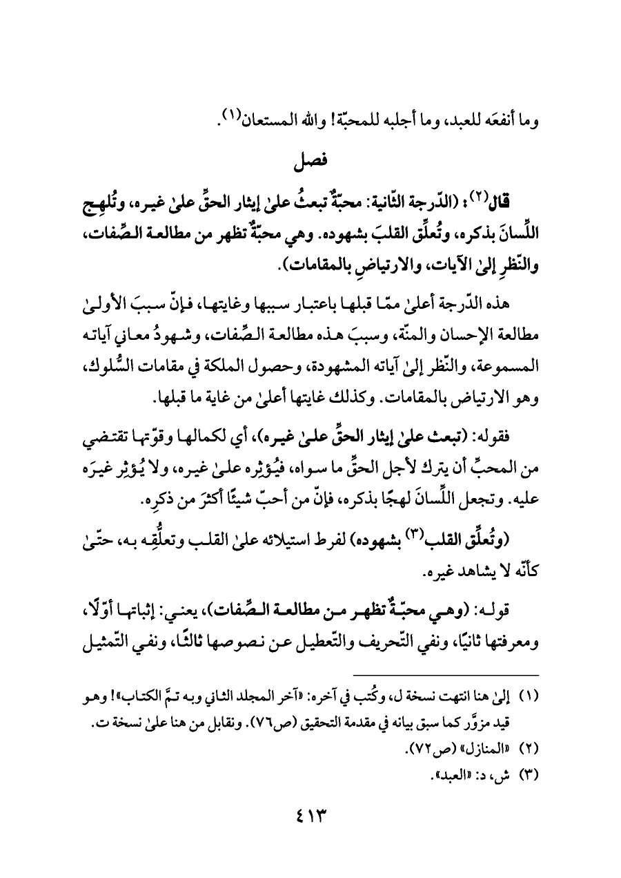 قال (¬٢): (الدّرجة الثّانية: محبّةٌ تبعثُ على إيثار الحقِّ على غيره، وتُلهِج اللِّسانَ بذكره, وتُعلِّق القلبَ بشهوده. وهي محبّةٌ تظهر من مطالعة الصِّفات، والنّظرِ إلى الآيات، والارتياضِ بالمقامات).