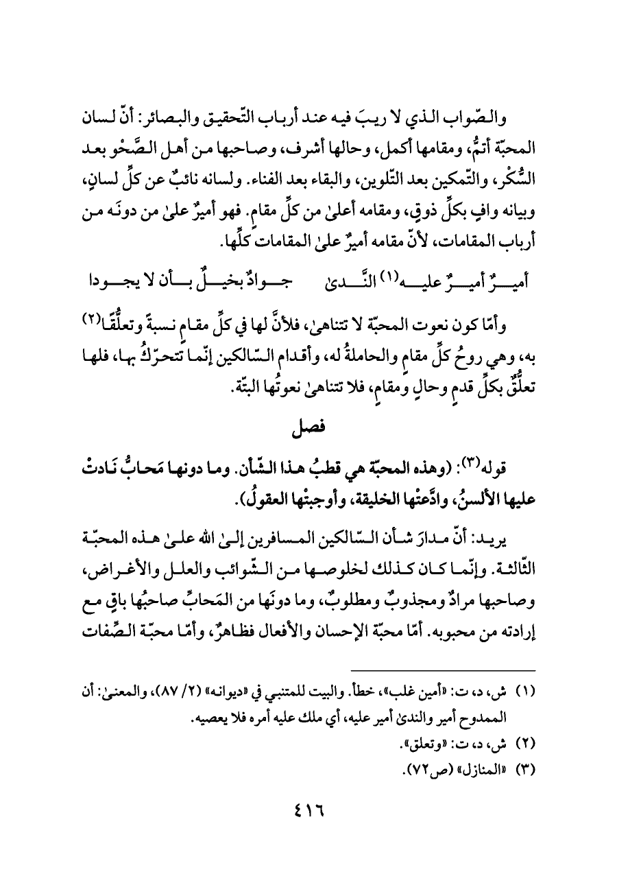 والصّواب الذي لا ريبَ فيه عند أرباب التّحقيق والبصائر: أنّ لسان المحبّة أتمُّ، ومقامها أكمل، وحالها أشرف، وصاحبها من أهل الصَّحْو بعد السُّكْر، والتّمكين بعد التّلوين، والبقاء بعد الفناء. ولسانه نائبٌ عن كلِّ لسانٍ، وبيانه وافٍ بكلِّ ذوقٍ، ومقامه أعلى من كلِّ مقامٍ. فهو أميرٌ على من دونَه من أرباب المقامات، لأنّ مقامه أميرٌ على المقامات كلِّها.
