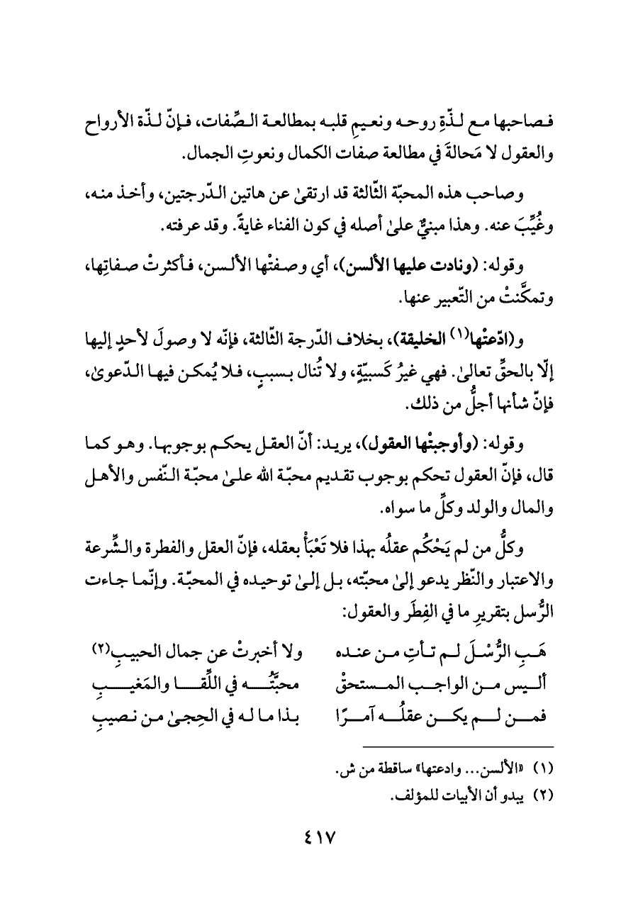 وصاحب هذه المحبّة الثّالثة قد ارتقى عن هاتين الدّرجتين، وأخذ منه، وغُيِّبَ عنه. وهذا مبنيٌّ على أصله في كون الفناء غايةً. وقد عرفته.