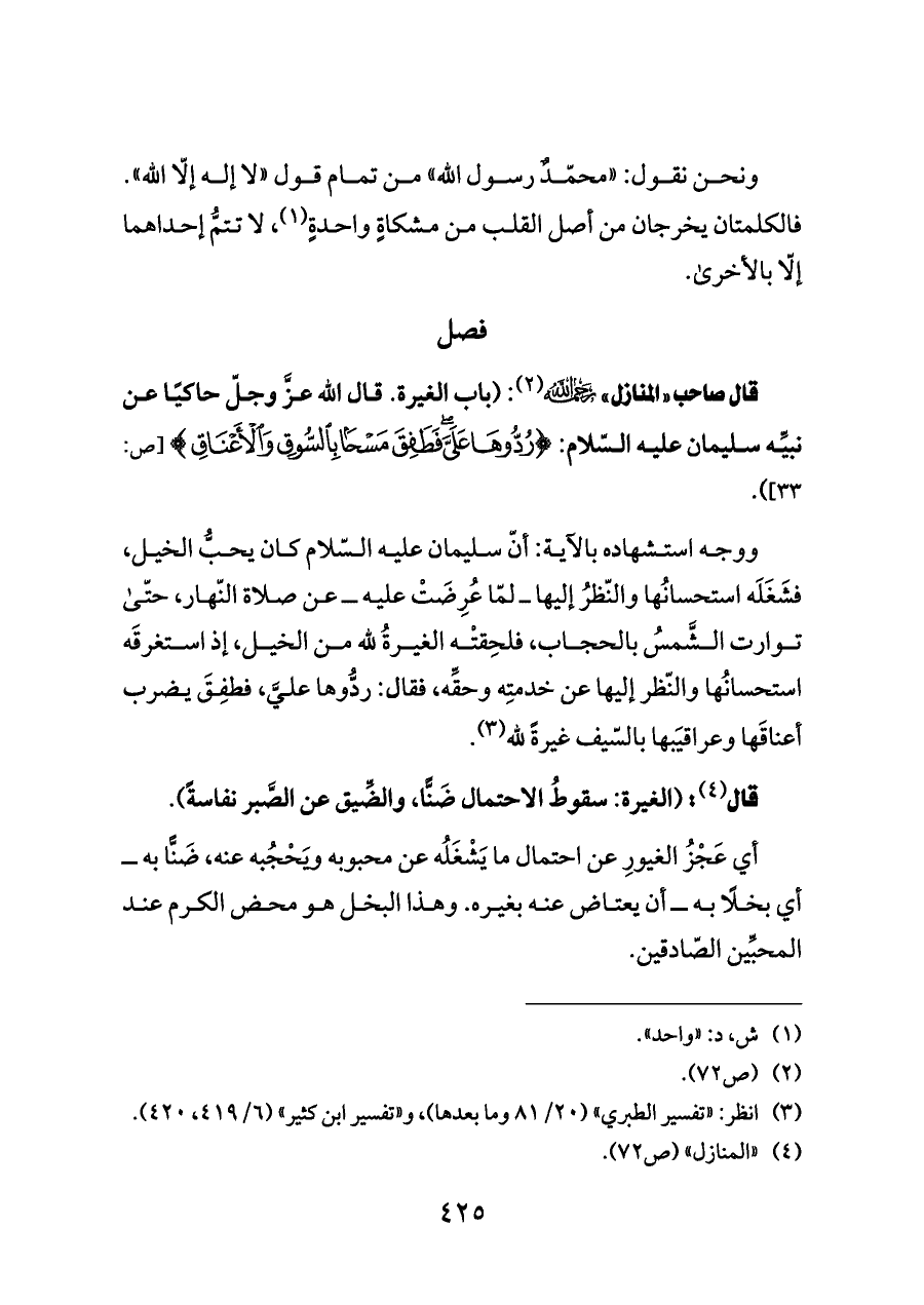 قال صاحب «المنازل» - رحمه الله - (¬٢): (باب الغيرة. قال الله عزَّ وجلّ حاكيًا عن نبيِّه سليمان عليه السّلام: {(٣٢) رُدُّوهَا عَلَيَّ فَطَفِقَ مَسْحًا بِالسُّوقِ} [ص: ٣٣]).