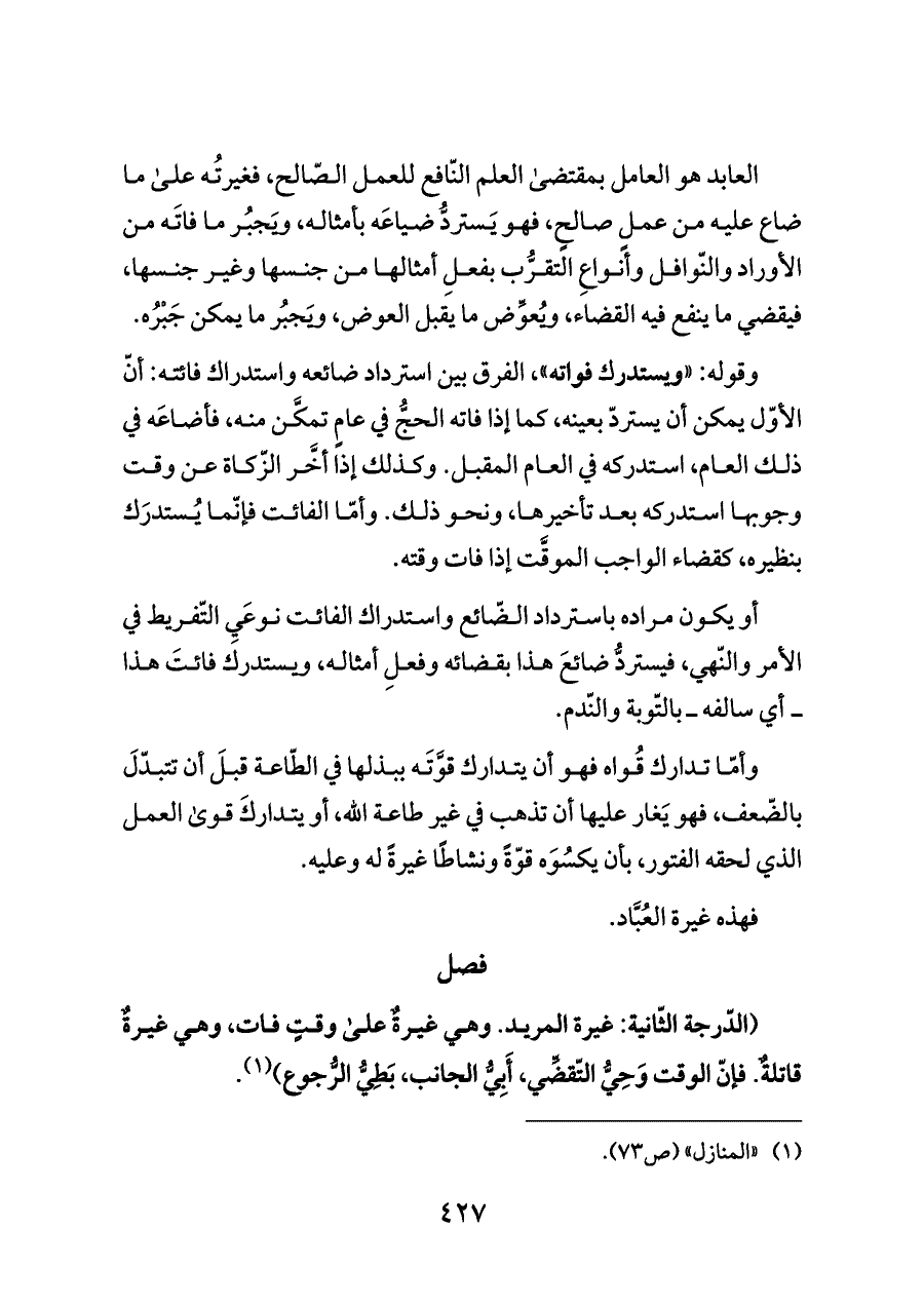 العابد هو العامل بمقتضى العلم النّافع للعمل الصّالح، فغيرتُه على ما ضاع عليه من عملٍ صالحٍ، فهو يَستردُّ ضياعَه بأمثاله، ويَجبُر ما فاتَه من الأوراد والنّوافل وأنواعِ التقرُّب بفعلِ أمثالها من جنسها وغير جنسها، فيقضي ما ينفع فيه القضاء، ويُعوِّض ما يقبل العوض، ويَجبُر ما يمكن جَبْرُه.