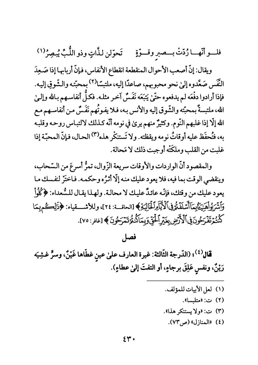 ويقال: إنّ أصعب الأحوال المنقطعة انقطاع الأنفاس، فإنّ أربابها إذا صَعِدَ النَّفَس صَعَّدوه إلى نحو محبوبهم، صاعدًا إليه، ملتبسًا (¬٢) بمحبّته والشّوقِ إليه. فإذا أرادوا دفْعَه لم يدفعوه حتّى يَتبَعَه نَفَسٌ آخر مثله. فكلُّ أنفاسهم بالله وإلى الله، ملتبسةٌ بمحبّته والشّوق إليه والأنس به، فلا يفوتُهم نَفَسٌ من أنفاسهم مع الله إلّا إذا غلبهم النّوم. وكثيرٌ منهم يرى في نومه أنّه كذلك لالتباس روحه وقلبه به، فتُحفَظ عليه أوقاتُ نومه ويقظته. ولا تَستنكْر هذه (¬٣) الحال، فإنّ المحبّة إذا غلبت من القلب وملكَتْه أوجبت ذلك لا مَحالة.