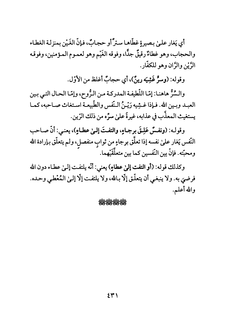 أي يَغار على بصيرةٍ غطّاها سترٌ أو حجابٌ، فإنّ الغَيْن بمنزلة الغطاء والحجاب، وهو غطاءٌ رقيقٌ جدًّا، وفوقه الغَيْم وهو لعموم المؤمنين، وفوقه الرَّيْن والرَّان وهو للكفّار.