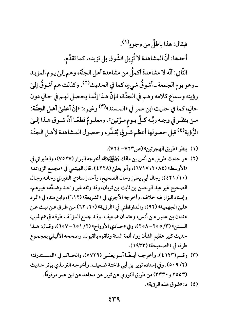 الثّاني: أنّه لا مشاهدةَ أكملُ من مشاهدة أهل الجنّة، وهم إلى يوم المزيد ــ وهو يوم الجمعة ــ أشوقُ شيءٍ، كما في الحديث (¬٢). وكذلك هم أشوقُ إلى رؤيته وسماع كلامه وهم في الجنّة، فإنّ هذا إنّما يحصل لهم في حالٍ دون حالٍ، كما في حديث ابن عمر في «المسند» (¬٣) وغيره: «إنّ أعلى أهل الجنّة: من ينظر في وجه ربِّه كلّ يومٍ مرّتين». ومعلومٌ قطعًا أنّ شوق هذا إلى الرُّؤية (¬٤) قبل حصولها أعظم شوقٍ يُقدَّر، وحصول المشاهدة لأهل الجنّة