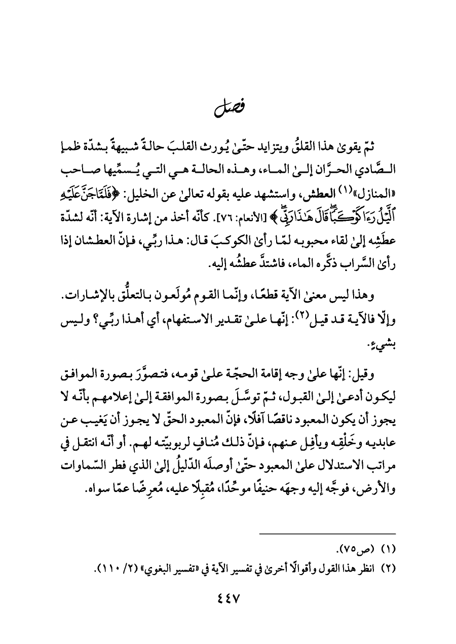 ثمّ يقوى هذا القلقُ ويتزايد حتّى يُورث القلبَ حالةً شبيهةً بشدّة ظمإ الصَّادي الحرَّان إلى الماء، وهذه الحالة هي التي يُسمِّيها صاحب «المنازل» (¬١) العطش، واستشهد عليه بقوله تعالى عن الخليل: {(٧٥) فَلَمَّا جَنَّ عَلَيْهِ اللَّيْلُ رَأَى كَوْكَبًا قَالَ هَذَا رَبِّي} [الأنعام: ٧٦]. كأنّه أخذ من إشارة الآية: أنّه لشدّة عطَشِه إلى لقاء محبوبه لمّا رأى الكوكبَ قال: هذا ربِّي، فإنّ العطشان إذا رأى السَّراب ذكَّره الماء، فاشتدَّ عطشُه إليه.
