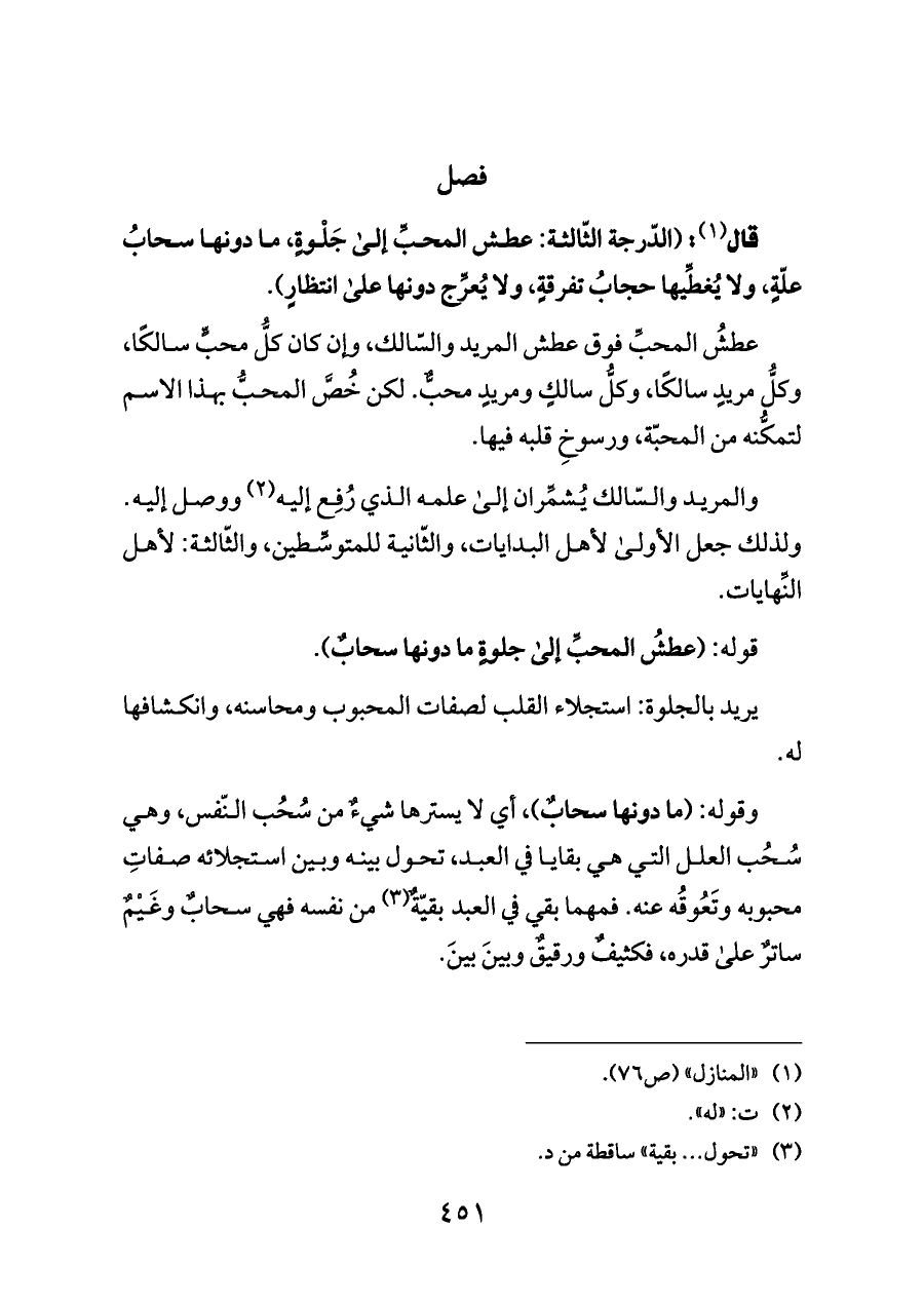 والمريد والسّالك يُشمِّران إلى علمه الذي رُفِع إليه (¬٢) ووصل إليه. ولذلك جعل الأولى لأهل البدايات، والثّانية للمتوسِّطين، والثّالثة: لأهل النِّهايات.