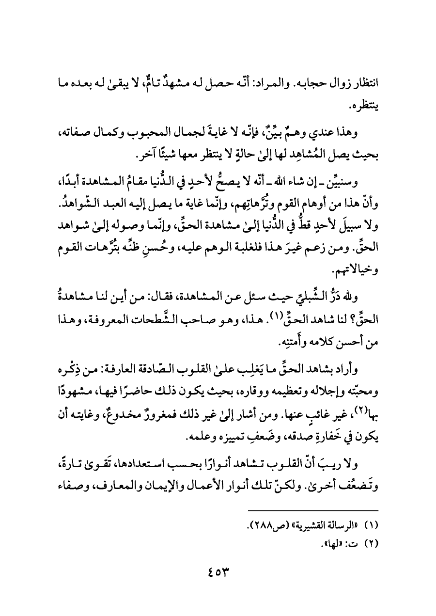 وسنبيِّن ــ إن شاء الله ــ أنّه لا يصحُّ لأحدٍ في الدُّنيا مقامُ المشاهدة أبدًا، وأنّ هذا من أوهام القوم وتُرَّهاتِهم، وإنّما غاية ما يصل إليه العبد الشّواهدُ. ولا سبيلَ لأحدٍ قطُّ في الدُّنيا إلى مشاهدة الحقِّ, وإنّما وصوله إلى شواهد الحقِّ. ومن زعم غيرَ هذا فلغلبة الوهم عليه، وحُسنِ ظنِّه بتُرَّهات القوم وخيالاتهم.